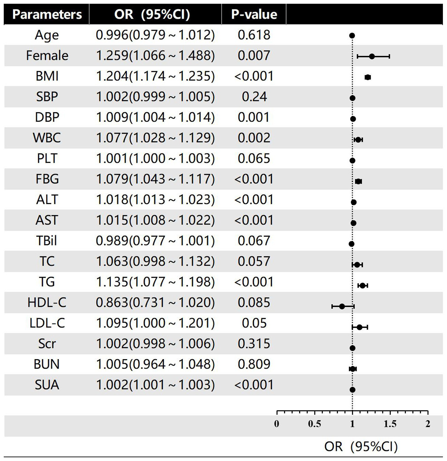 In this investigation, the severity of hepatic steatosis in MAFLD, based on ultrasound grading, was considered as the dependent variable. Univariate logistic regression analysis considered factors such as age, gender, BMI, FBG and blood pressure as independent variables. The results indicated that female gender, BMI, WBC, DBP, ALT, FBG, AST, SUA and TG were all risk factors for the severity of hepatic steatosis in MAFLD (p < 0.05; refer to Figure 2). Furthermore, the multivariate logistic regression analysis revealed that female gender, BMI, ALT, FBG, TG, and SUA remained significant after adjusting for all other variables in the model (p < 0.05; refer to Figure 3). And female gender (OR 1.345, 95%CI: 1.116 ~ 1.623) and BMI (OR 1.193, 95%CI: 1.162 ~ 1.225) had the greatest effect on hepatic steatosis in MAFLD.