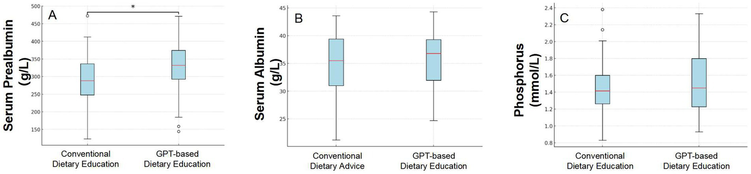 Figure 2. Comparison of three indicators (Serum Prealbumin levels, Serum Albumin levels, and Serum Phosphate) before and after dietary intervention based on conventional advice and GPT-guided recommendations.