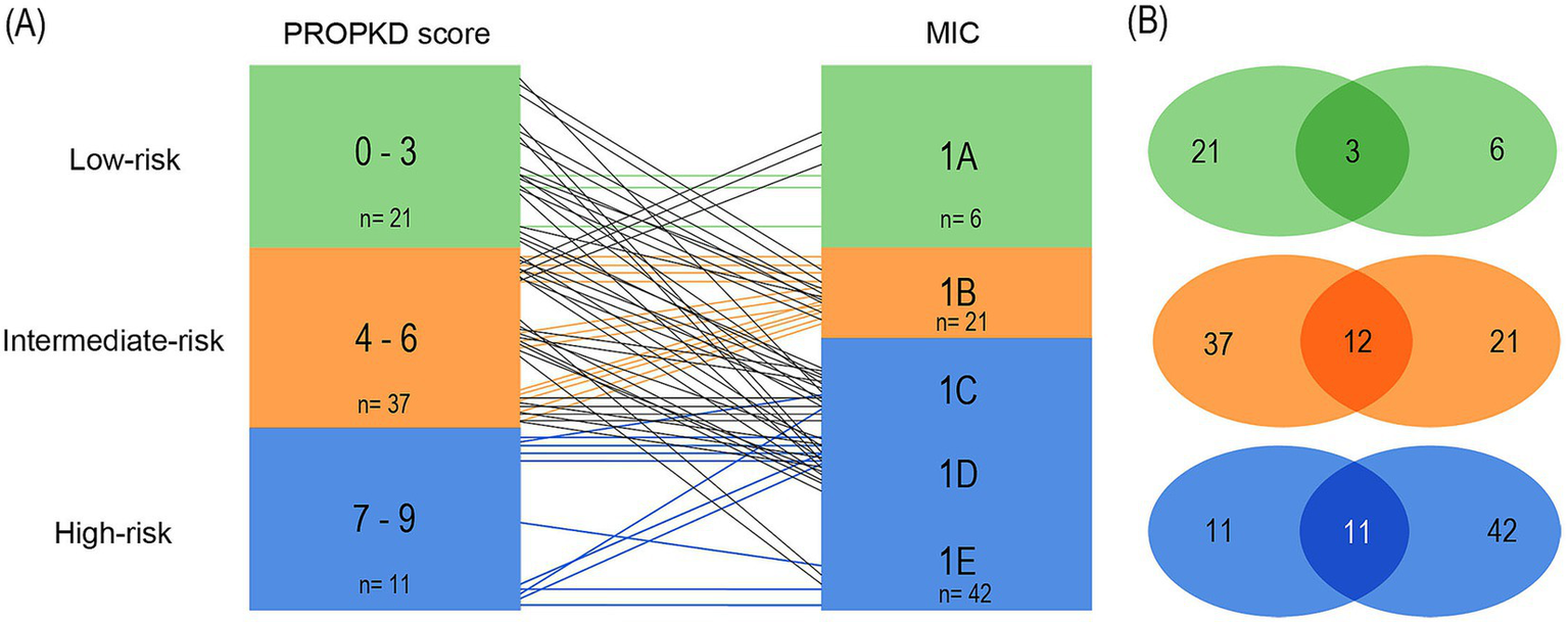 Figure 8. Agreement of kidney failure risk categories defined by the PROPKD score and the MIC in 69 patients with ADPKD, model 2. Low-risk in green color (PROPKD score 0 to 3, MIC 1A and 1B), intermediate-risk in orange color (PROPKD score 4 to 6, MIC 1C), and high-risk in blue color (PROPKD score 7–9, MIC 1D and 1E). (A) Agreement between risk categories is indicated by colored lines, disagreement by black lines. (B) Numbers in the middle indicate the count of patients showing agreement of kidney failure risk categories.