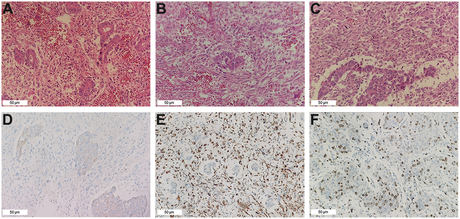 The patient recovered well and was discharged smoothly. However, the patient was readmitted to the hospital just 5 months after the surgery due to upper abdominal pain. Enhanced CT of the upper abdomen revealed two areas of low enhancement in the surgical region, with clear boundaries. The larger region was approximately 15 cm, and contained multiple necrotic regions (Figures 1D–F). Based on the patient’s medical history, tumor recurrence was considered, and rapid growth of the tumor rendered surgical intervention unfeasible. Chemotherapy and local interventional palliative therapy were recommended. However, the patient’s family refused further treatment, and the patient was discharged. Just 9 days after discharge, the patient passed away at home. Survival time after the operation was only 5 months.