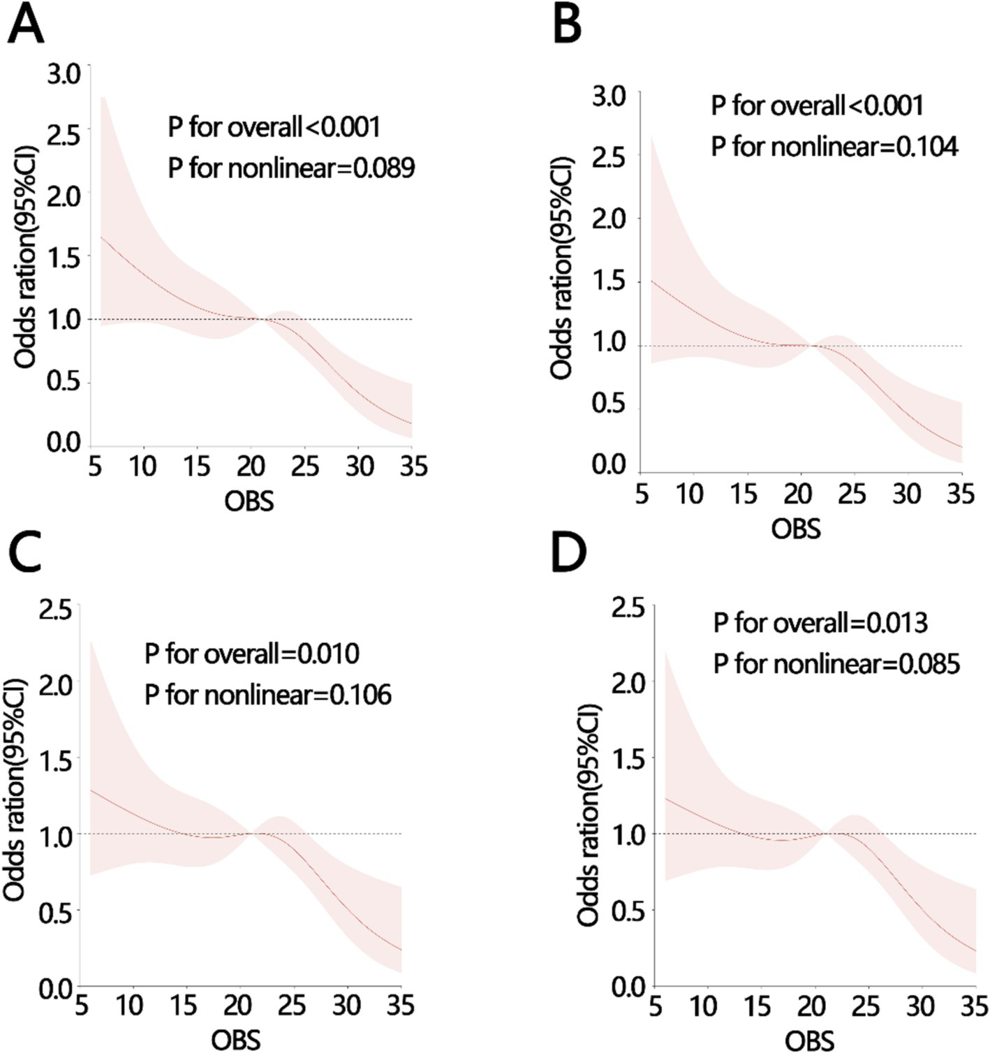 The RCS analysis between OBS and constipation with different adjustments (A) crude model: without adjustment, (B) model 1: adjusting for age, PIR, sex, and marital status, (C) model 2: adjusting for, age, PIR, sex, marital status, water intake, (D) model 3: adjusting for, age, PIR, sex, marital status, water intake, Hypertension, diabetes, depression severity. PIR, poverty income ratio; OBS, oxidative balance score.