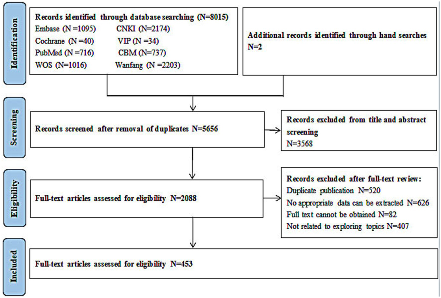 A systematic search was performed in four English databases (PubMed, Embase, Web of Science, and the Cochrane Library) and four Chinese databases (Chinese Biomedical Literature Database, China National Knowledge Infrastructure, China Science and Technology Journal Database, and Wanfang Database). Of the 8,015 retrieved full-text manuscripts, 453 were selected.