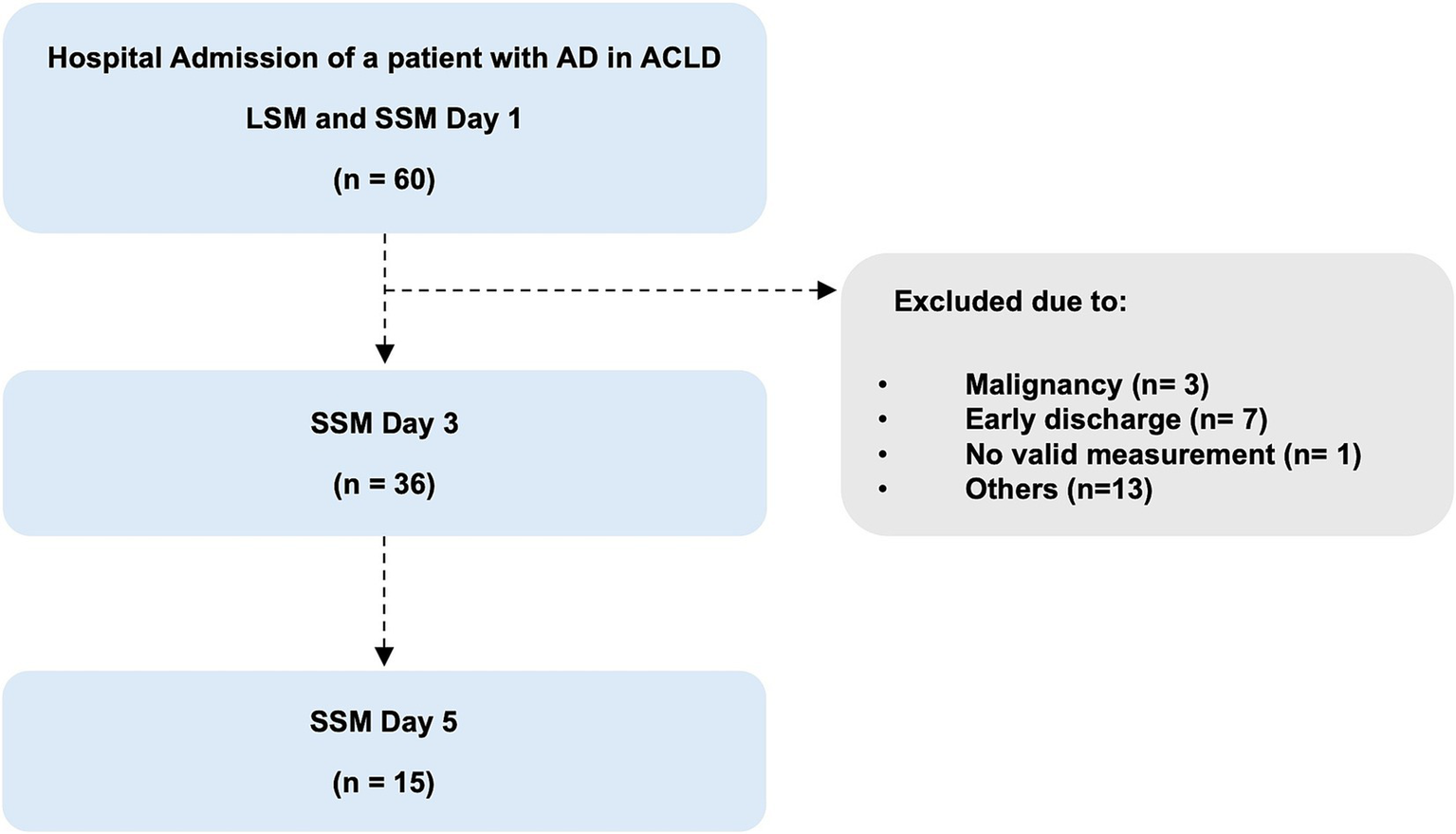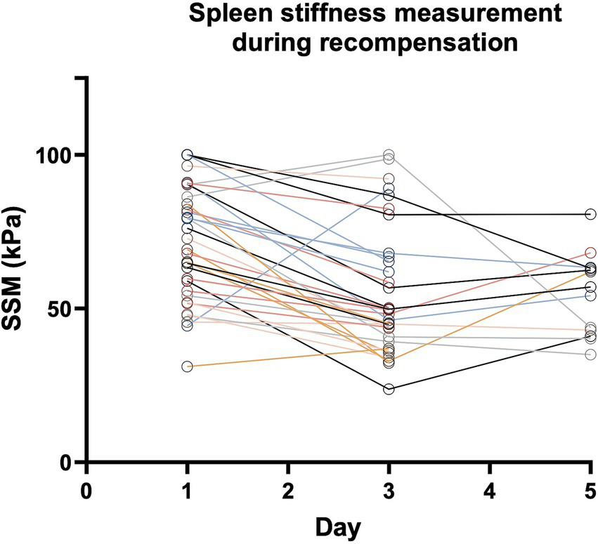 Finally, 36 patients completed at least two or more measurements of spleen stiffness during recompensation. In detail, 15 of these 36 patients were measured at day 1, 3, and 5 and 21 patients were measured at day 1 and 3 (Figure 1).