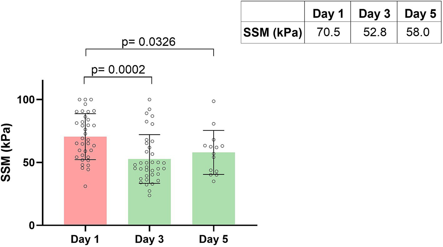 The control group with compensated cirrhosis showed a spleen stiffness of 29.1 ± 11.2 kPa on day 1 and 32.8 ± 8.6 kPa on day 3, respectively. Thus, there was no significant change between the SSM from day 1 to day 3 (p = 0.41) as could be expected in this stable clinical situation. Interestingly, spleen stiffness in patients of the control group was <45 kPa in every single measurement.