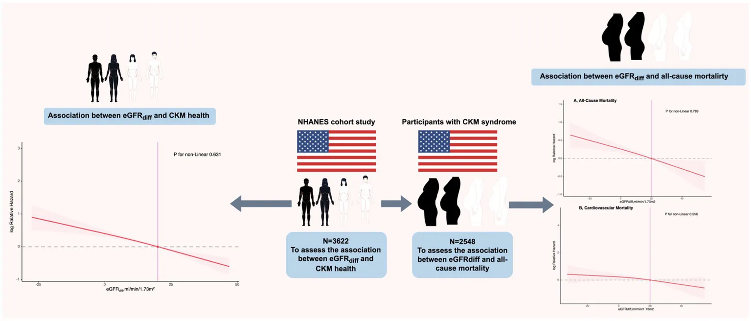 The objectives of this study were to examine the association between eGFRdiff and AHA-defined CKM health and to investigate the relationship between eGFRdiff and mortality in patients with CKM syndrome.