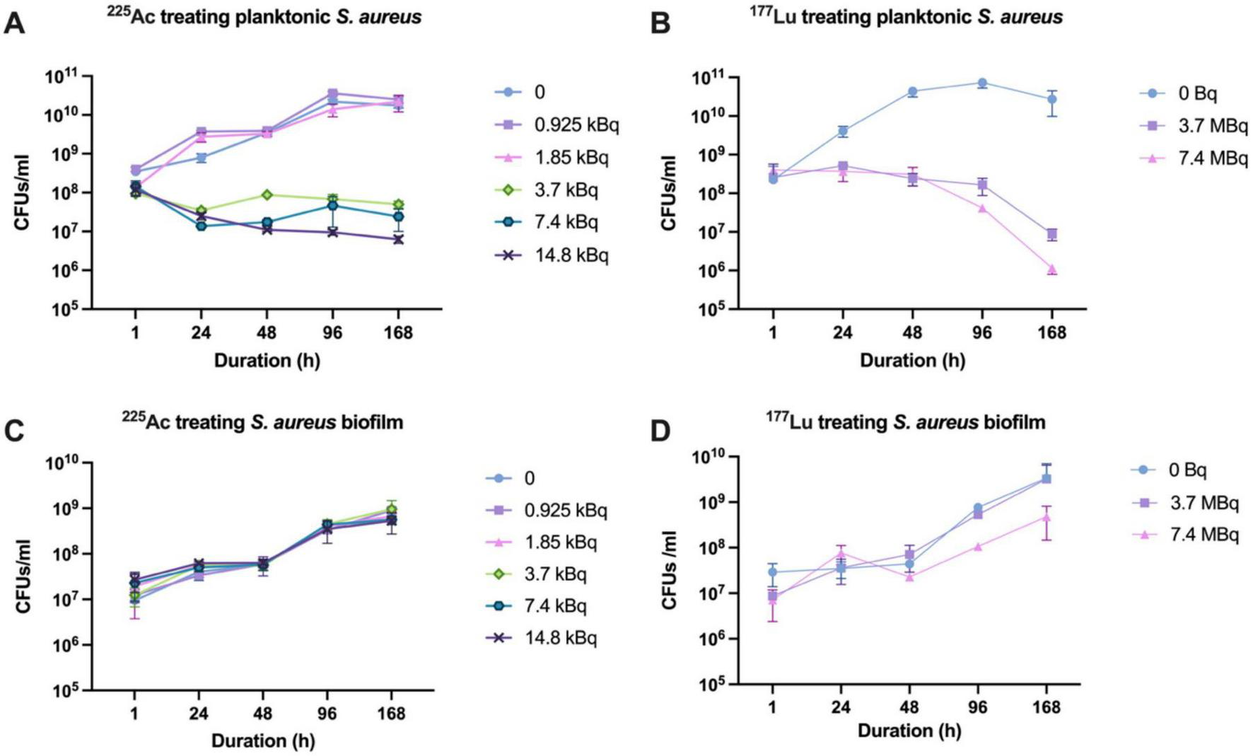 Susceptibility of S. aureus and its biofilm to 225Ac and 177Lu. (A) Susceptibility of planktonic S. aureus to 225Ac. (B) Susceptibility of planktonic S. aureus to 177Lu. (C) Susceptibility of S. aureus in biofilm state to 225Ac. (D) Susceptibility of S. aureus in biofilm state to 177Lu.