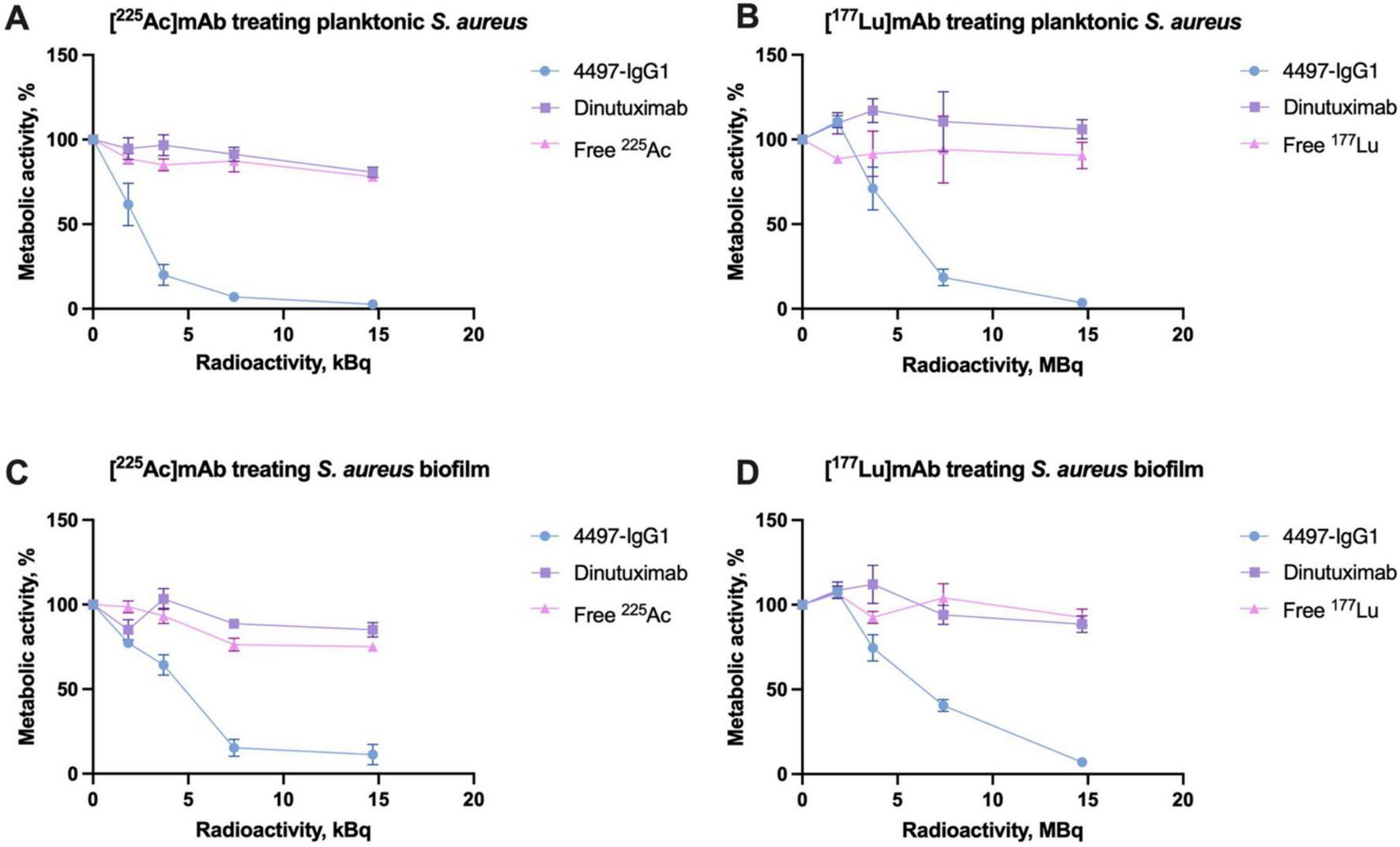 In conclusion, our study illustrates the potent antibacterial activity of [225Ac]4497-IgG1 and [177Lu]4497-IgG1 against both planktonic and biofilm-associated S. aureus in vitro. These findings suggest that radioimmunotherapy holds promise as a novel and effective therapeutic approach for tackling stubborn biofilm-associated infections. Further, in vivo studies are necessary to confirm these results and to evaluate the safety and efficacy of this approach in clinical settings.