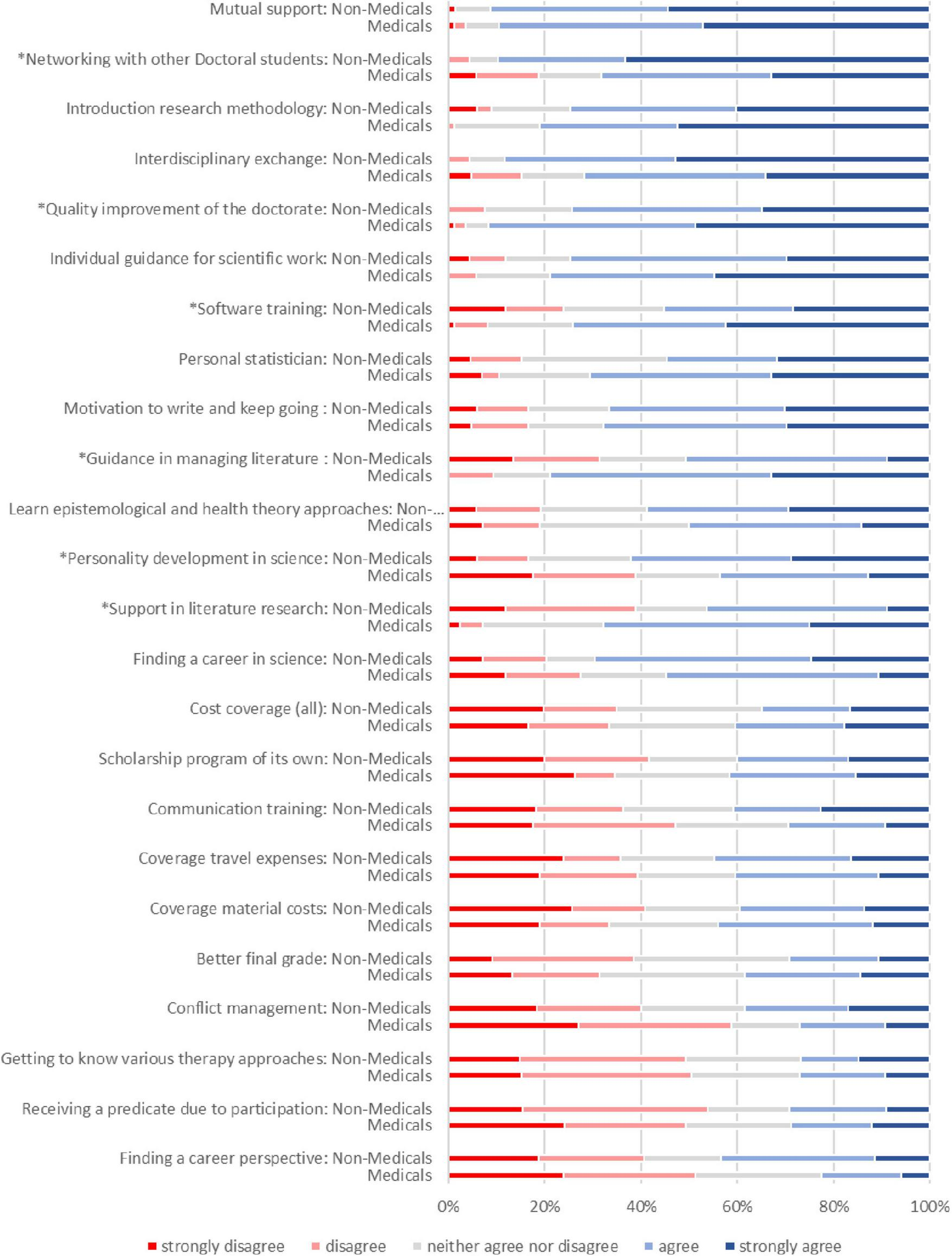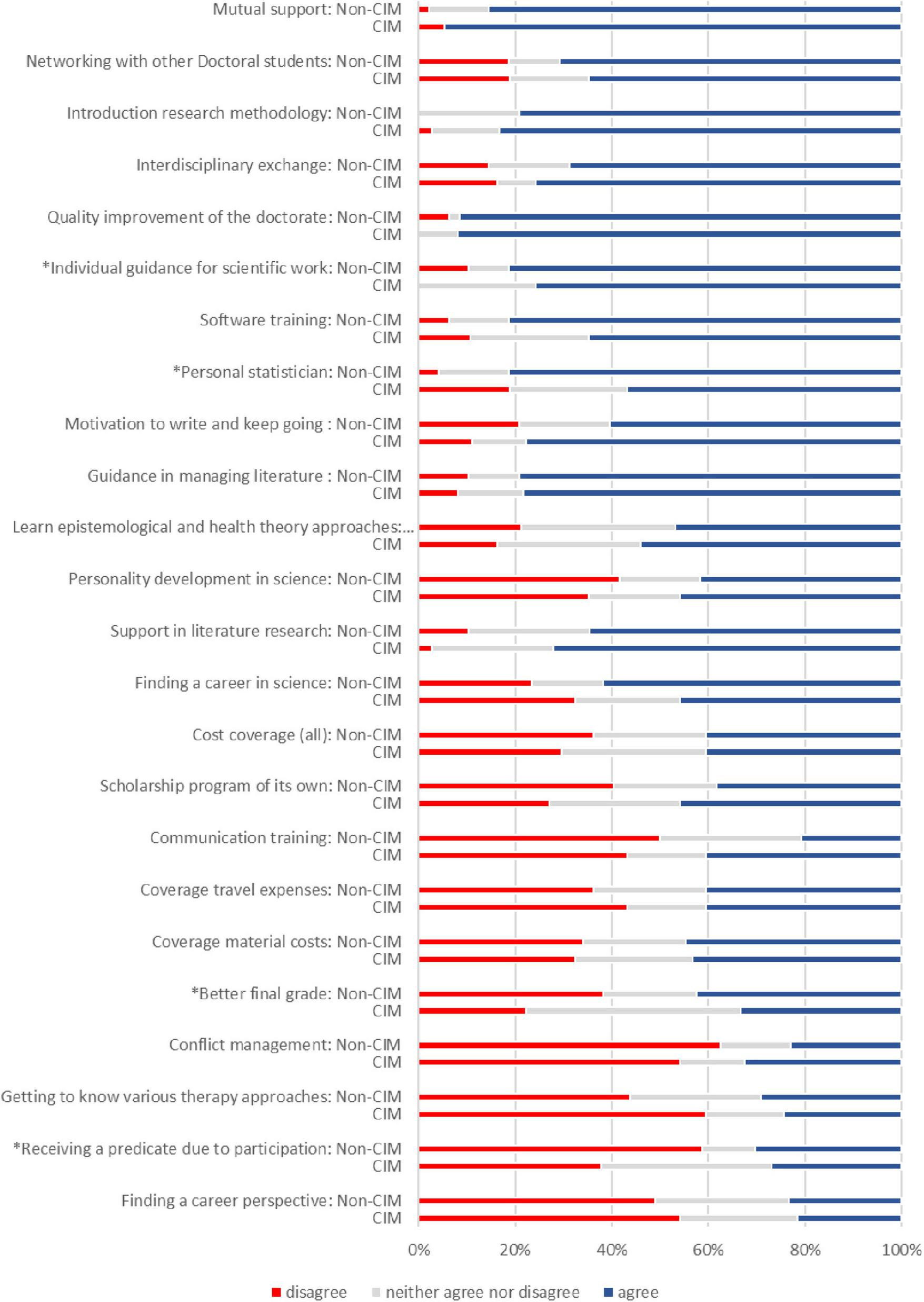 Expectations of a graduate school (5-point-Likert scales “strongly disagree” to “strongly agree”) - comparison of medical doctoral students with CIM and Non-CIM topic. For this figure the categories “strongly disagree” and “disagree” were combined into “disagree,” “strongly agree” and “agree” were combined to “agree.” *Indicates group differences (p ≤ 0.05).