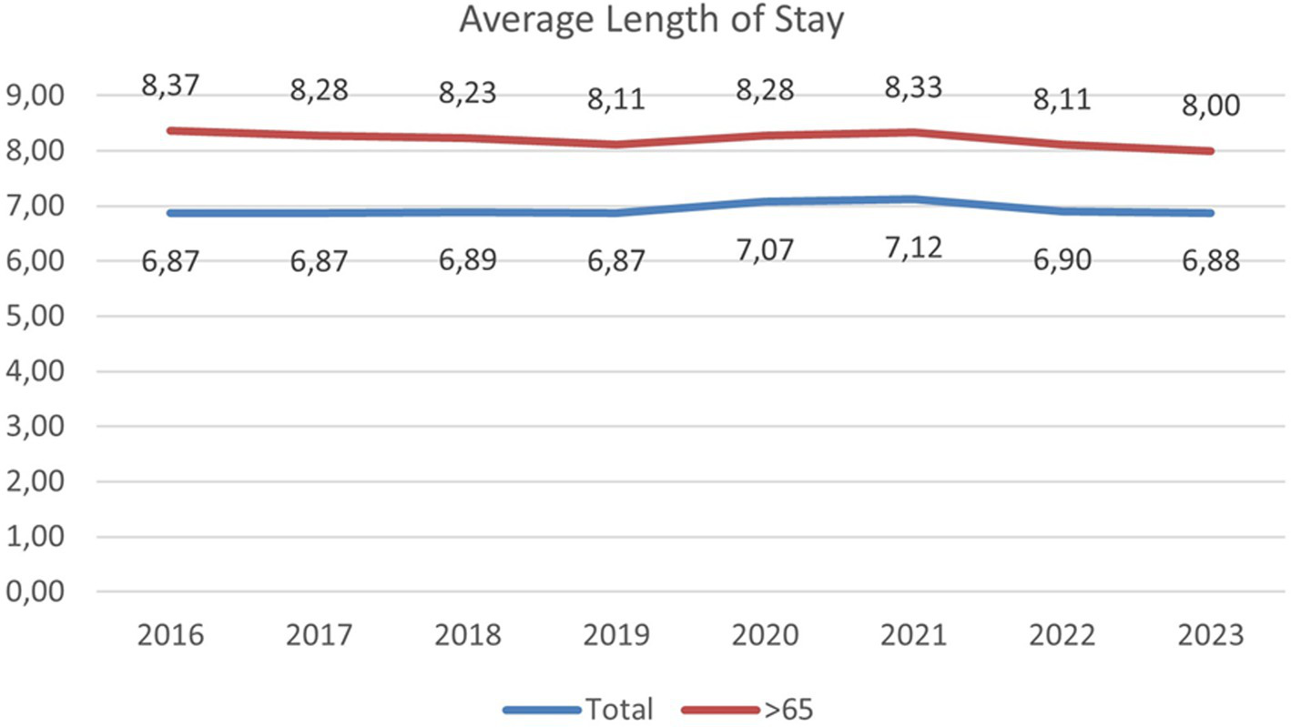 The first selected indicator is the average length of stay, reflecting an overall proxy of healthcare service utilization and its impact on efficiency and sustainability. Figure 3 depicts its evolution from 2016 to 2023, including the average length of stay for the total inpatient population and those over the age of 65. The average length of stay remains more or less constant for the total inpatient population but decreases for those over the age of 65 except the years affected by the COVID-19 pandemic. Multiple factors can influence this trend, but shorter inpatient stays contribute to the overall sustainability of the healthcare system.