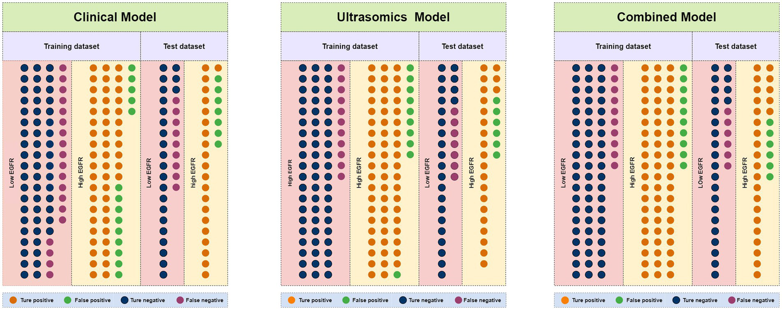 In 198 patients, high EGFR expression was observed in 100 patients and low EGFR expression was observed in 98 patients. The RF machine learning ultrasomics model was found to perform well, with the AUC of the training and test dataset being 0.929 (95%CI, 0.874–0.966) and 0.807 (95%CI, 0.684–0.897) respectively, the sensitivity being 0.843 and 0.767 respectively, the specificity being 0.857 and 0.800 respectively, and the accuracy being 0.850 and 0.783, respectively. The predictive performance of the combined model established by integrating ultrasomics features and clinical baseline characteristics was improved, with the AUC, sensitivity, specificity, and accuracy of the RF machine learning combined model for the training and test dataset reaching 0.937 (95%CI, 0.884–0.971), 0.822 (95%CI, 0.702–0.909); 0.857, 0.833; 0.857, 0.800; 0.857, 0.817, respectively.