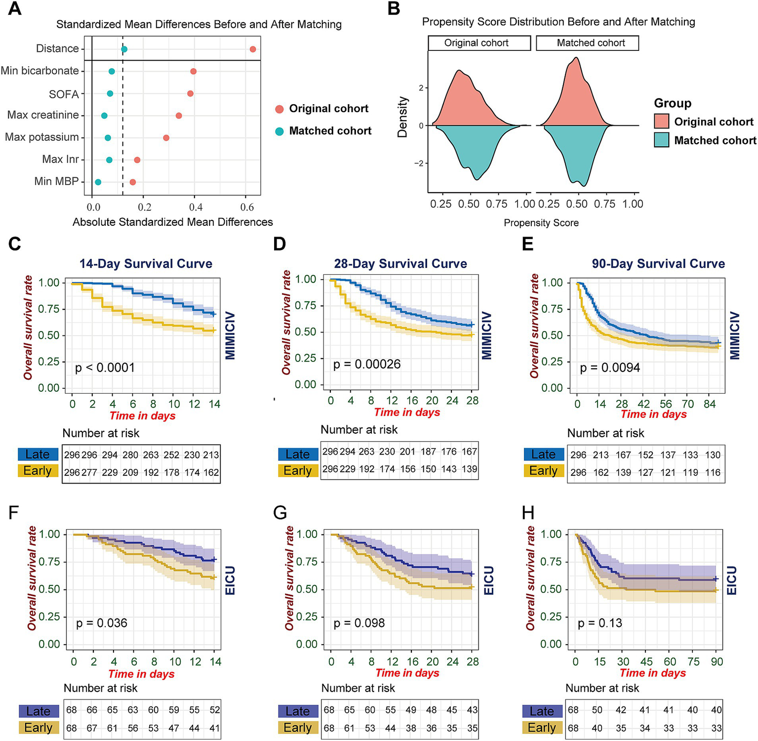 We conducted survival analyses on both the original cohort and the propensity score-matched cohort using the Kaplan–Meier method consistent with our previous work (25). Using the median time interval between AKI onset and CRRT initiation as the threshold, patients were stratified into early and late CRRT groups. The analysis was performed using R (version 4.3.2) and encompassed both short-term outcomes (14-day, 28-day, and 90-day survival) and long-term outcomes (1-, 2-, and 3-year survival). We employed the log-rank test to assess statistical differences in survival distributions between groups. To ensure robustness of our findings, we performed parallel analyses in both the MIMIC-IV and eICU databases. The initial analysis on the complete cohort examined unadjusted survival differences, while the subsequent analysis on the propensity score-matched cohorts provided survival outcomes with balanced baseline characteristics, thus minimizing potential confounding effects.