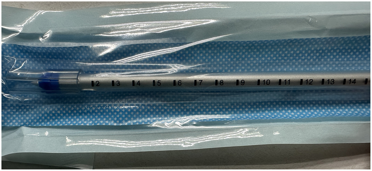 The chest tubes were performed by the same person. Generally, we placed the chest tube with a needle (PAHSCO, 28 Fr with 9.33 mm in diameter, Figure 4) in the “triangle of safety,” which was inserted straight to the top of the chest cavity through the anterior mediastinum pathway, the key points of simple procedures: (a) Usually, the patient lies in a reclining position on the bed with the arms abducted, identify the “triangle of safety:” the center of the axilla, the lateral aspect of musculus latissimus dorsi, and the lateral pectoralis major at the line of the nipple. (b) An incision approximately with 1–2 cm was made at the 3th intercostal space at the lateral edge of the pectoralis major muscle nearby the anterior axillary line through the “triangle of safety,” as like red cross mark b-2. The b-1 red cross mark is the first chest tube which was placed after surgery. (c) Muscle tissue is then dissected using a blunt instrument e.g., a set of arterial forceps, creating a canal to the parietal pleura which is then breached for access to the pleural cavity. A hiss of air, or ooze of blood may present at this point. (d) The pleural cavity is explored using a finger, assessing for the position of the lung and any adhesions. The resulting tube remains open to allow enough air to enter the chest cavity. In the case of artificial pneumothorax, the chest tube is inserted into the chest cavity under the guidance of needle. Be careful not to puncture the lung or other tissues to avoid secondary damage. In our experience, the tube with the side hole is usually placed in the top of the chest cavity at a scale of 12–14 cm [Figure 3 (11)]. Moreover, the tube was connected to water-seal bottles with negative pressure.