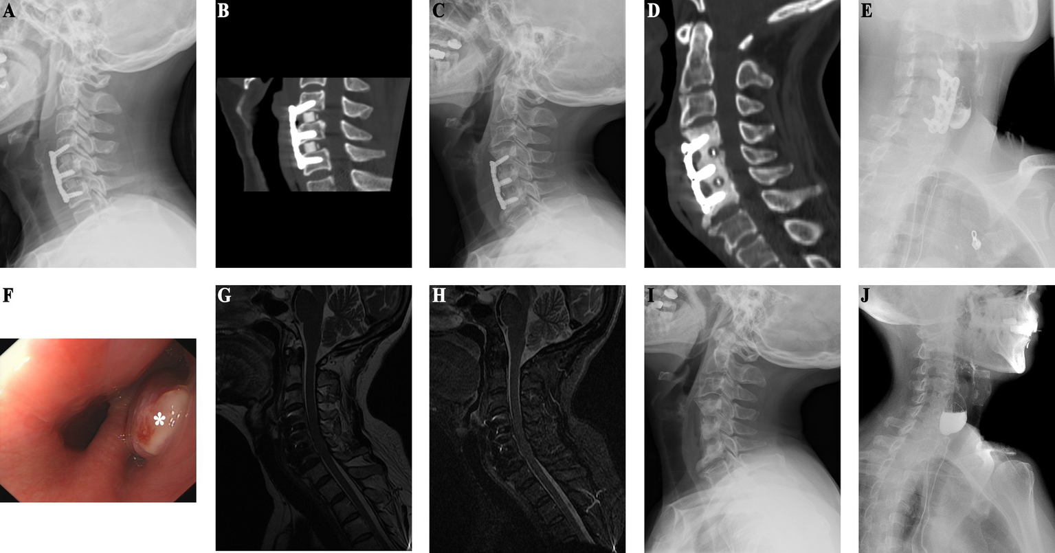 An adult patient with myelopathy underwent C6 ACCF in 2004. She developed right neck and shoulder pain and was suspected to have an esophageal perforation based on esophagography performed 6 months postoperatively. However, gastrointestinal endoscopy did not confirm the presence of an esophageal perforation. Over the next 7 years, she experienced persistent pain and sought medical attention multiple times without receiving a diagnosis. At 7 years postoperatively, she developed a mass in the right neck that was unable to be located during biopsy attempts. At 10 years postoperatively, she was diagnosed with lymphoma, which was later revealed to be caused by an esophageal perforation. On cervical radiography, the internal fixation of the cervical spine was structurally good, but there was a local bone defect in the C5–7 vertebrae under the steel plate (Figure 1A). CT showed a partial bone defect in the C5–7 vertebral bodies and swelling of the right paravertebral soft tissue with pneumata and effusion (Figure 1B). MRI showed localized swelling and effusion in the paravertebral soft tissues (Figures 1C,D). During esophagography, the contrast agent leaked into the soft tissues of the cervical spine to reveal a large surrounding cavity (Figure 1E). Gastrointestinal endoscopy revealed an esophageal diverticulum, a 5-cm-long ulcerative defect in the posterior wall of the esophagus, and a visible cervical steel plate (Figure 1F). Surgery revealed a large esophageal diverticulum with rupture, which was treated with esophagoplasty and muscle flap closure. Two years after the final esophageal perforation repair, X-ray shows preserved cervical spine curvature, C5-7 vertebral body bone loss, and removal of internal fixation (Figure 1G). MRI T2-weighted and STIR images demonstrate mixed anterior high and low signal intensity with partial vertebral body defects (Figures 1H,I). Esophagography shows a 2.0 x 0.6 cm intraluminal esophageal outpouching (Figure 1J). After 8 years of follow-up, her symptoms had resolved and the wound had healed.