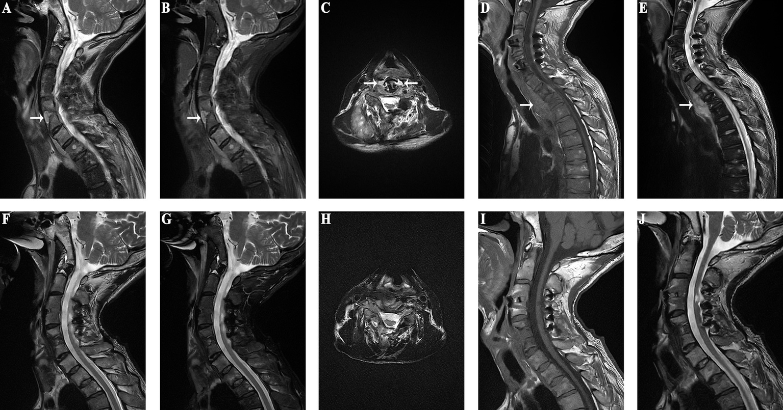 (Case 4) (A–C) An inflammatory mass anterior to the C5/6 vertebrae is observed preoperatively (as indicated by the white arrow in the diagram). (D) MRI of the thoracic spine reveals low signal intensity anterior to the C7-T2 vertebrae on T1-weighted images (as pointed by the arrow in the diagram). (E) MRI of the thoracic spine shows high signal intensity anterior to the C7-T2 vertebrae on T2-weighted images (as indicated by the arrow in the diagram). (F–H). Postoperative MRI shows no inflammatory mass in front of the cervical spine. (I) Resolution of the low signal intensity anterior to the C7-T2 vertebrae on T1-weighted images. (J) Disappearance of the high signal intensity anterior to the C7-T2 vertebrae on T2-weighted images.