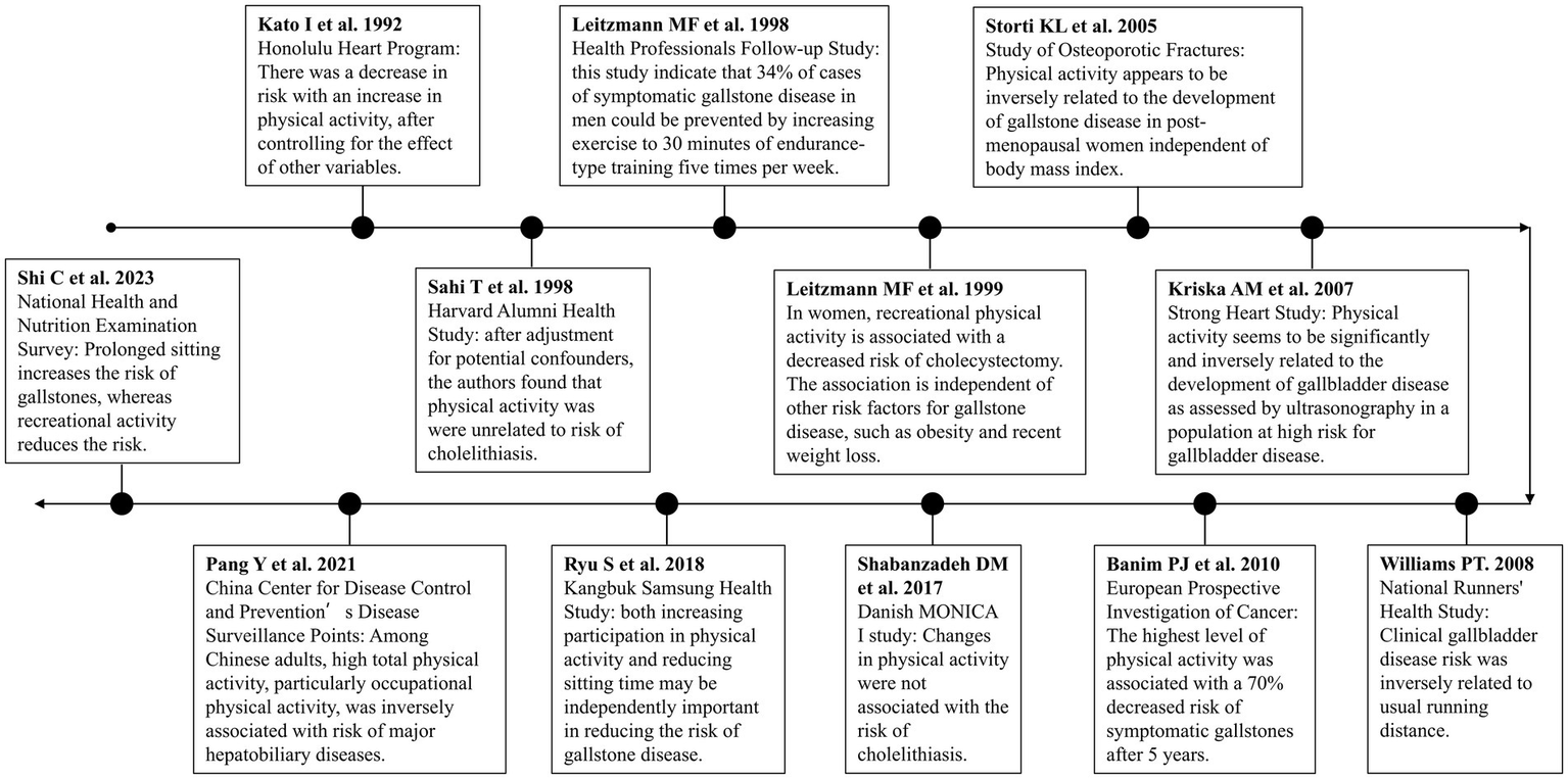 Twelve cohort studies investigating the relationship between physical activity and risk of cholelithiasis were reviewed in this review. To better illustrate the development of research in this field, we created a timeline of physical activity and gallstone disease studies (Figure 1). This timeline demonstrates the evolution of research from early observational studies to more recent large-scale cohort studies and Mendelian randomization analyses. All included studies relied on self-reported physical activity to assess the exposure variable. The majority of these studies found an inverse association between physical activity and the risk of developing gallstones or symptomatic gallbladder disease.