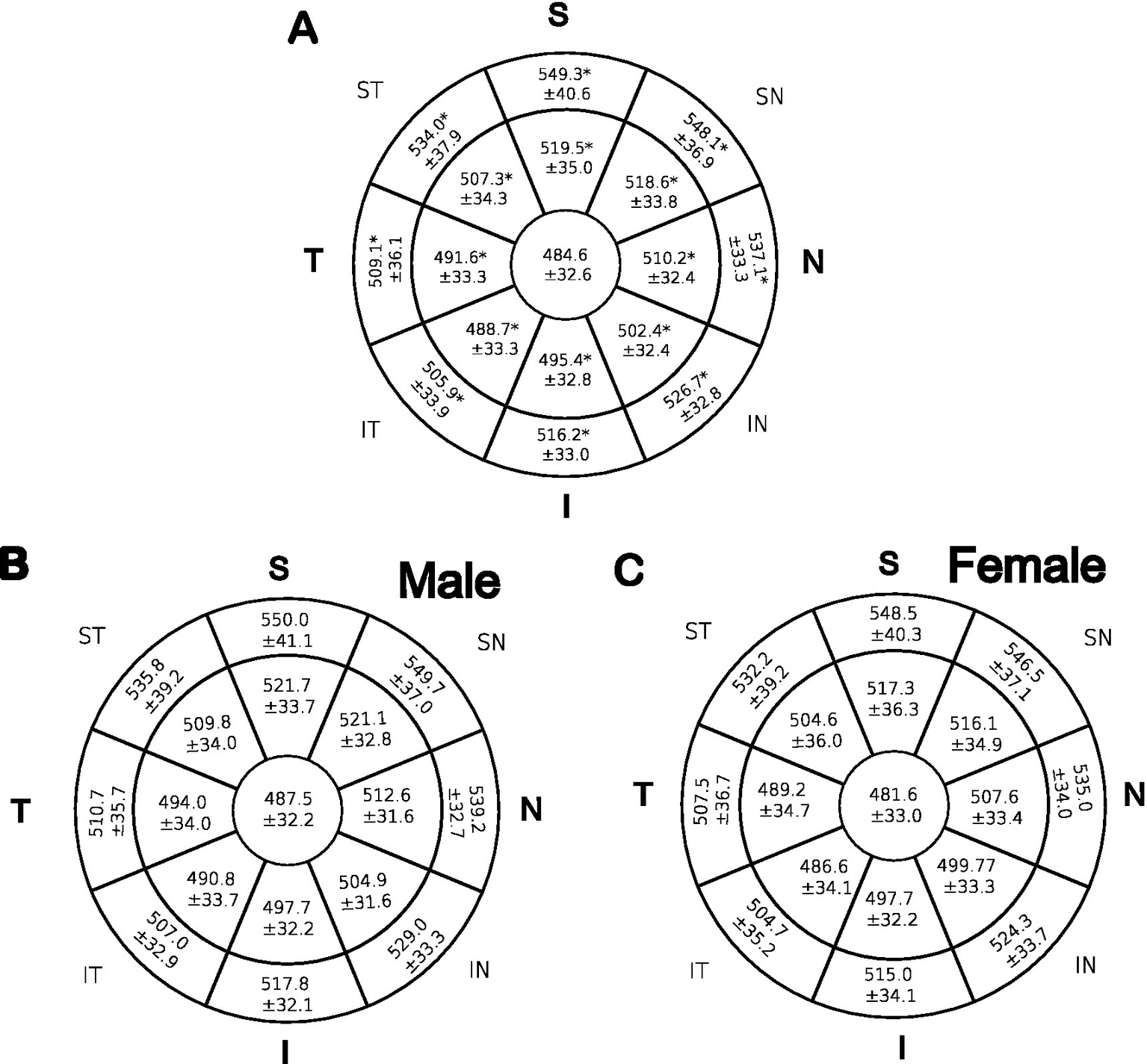Mean CST in μm across 17 zones that make up eight octants. The means of each zone were compared using one-way ANOVA. (A): represent all patients. Student t-test was performed for panel (B) males and (C) females. *indicates significant p values < 0.05.
