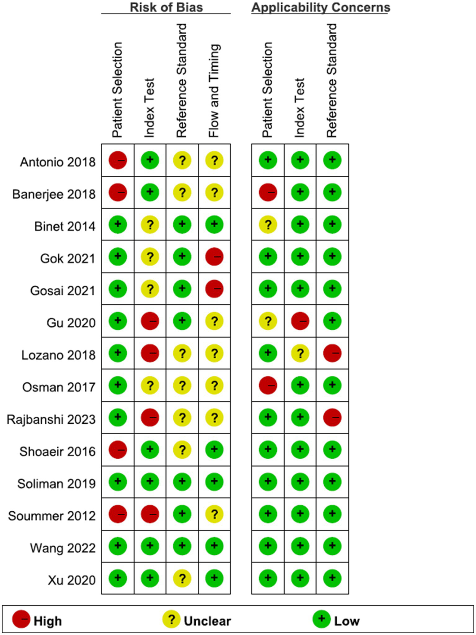 Figure 2. Risk of bias and applicability concerns assessment with the Quality Assessment of Diagnostic Accuracy Studies (QUADAS).