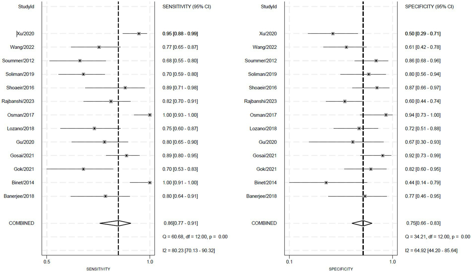 Sensitivity analysis, including impact analysis and outlier detection, identified two outliers for LUS (see Supplementary Figure 7). Excluding these outliers in subgroup analysis resulted in a slightly reduced sensitivity (0.81, 95% CI 0.74–0.86) and an almost unchanged specificity (0.75, 95% CI 0.66–0.82). The fitness and bivariate normality analyses confirmed the moderate robustness of the random-effects bivariate model used in this meta-analysis.