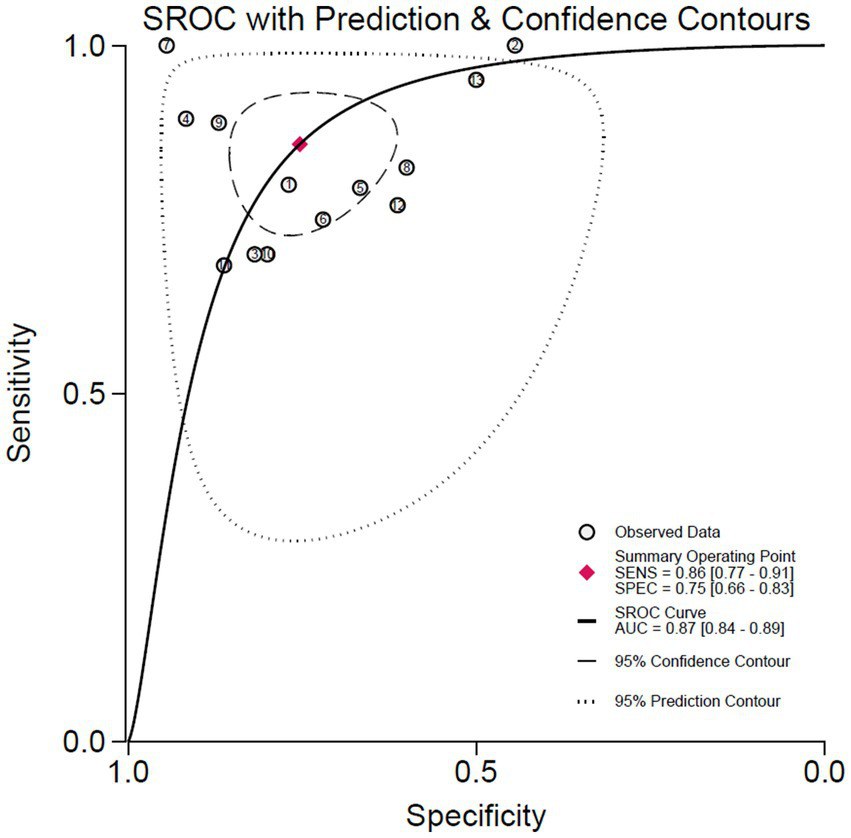 Figure 4. Summary receiver-operating characteristic curve illustrating the summary point and the study estimate of the sensitivity and specificity, and the 95% confidence and prediction contour for weaning failure prediction.