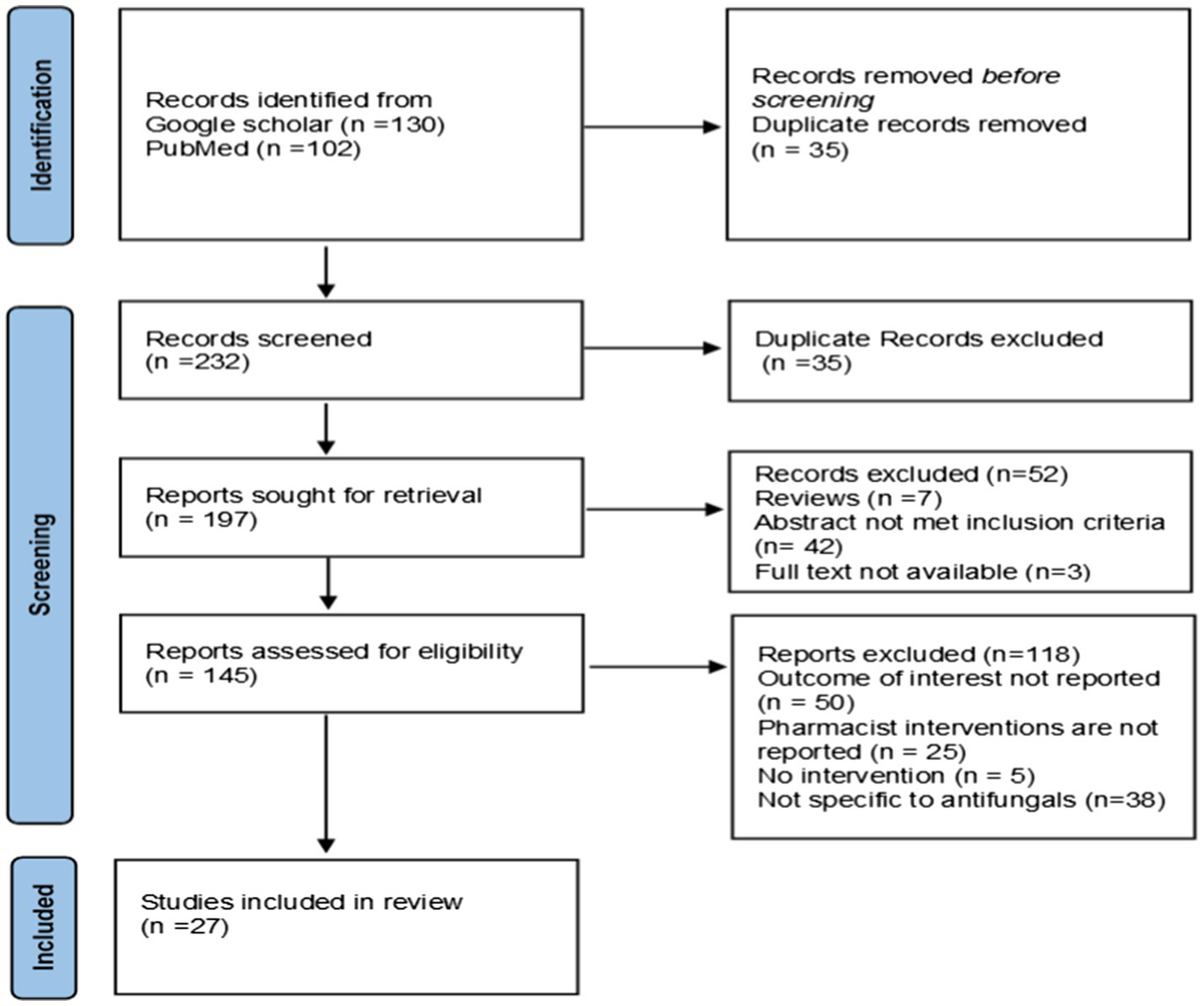 A comprehensive search was carried out to gather data on pharmacist interventions as a member of the antifungal stewardship team on optimizing antifungal use. The literature was searched through Google Scholar using the keywords “Antifungal stewardship and/or antimicrobial stewardship and/or pharmacist interventions and/or consumption and/or quality of antifungal use and/or clinical outcomes” which provided 130 publications; literature search through PubMed that derived 69 publications with mesh terms “Antimicrobial Stewardship” AND “Antifungal Agents” and 33 publications with mesh terms “Antimicrobial Stewardship” AND “Antifungal Agents” AND “Invasive Fungal Infections/Drug Therapy.” All the available data for the period 2018–2023 was searched in October 2023.