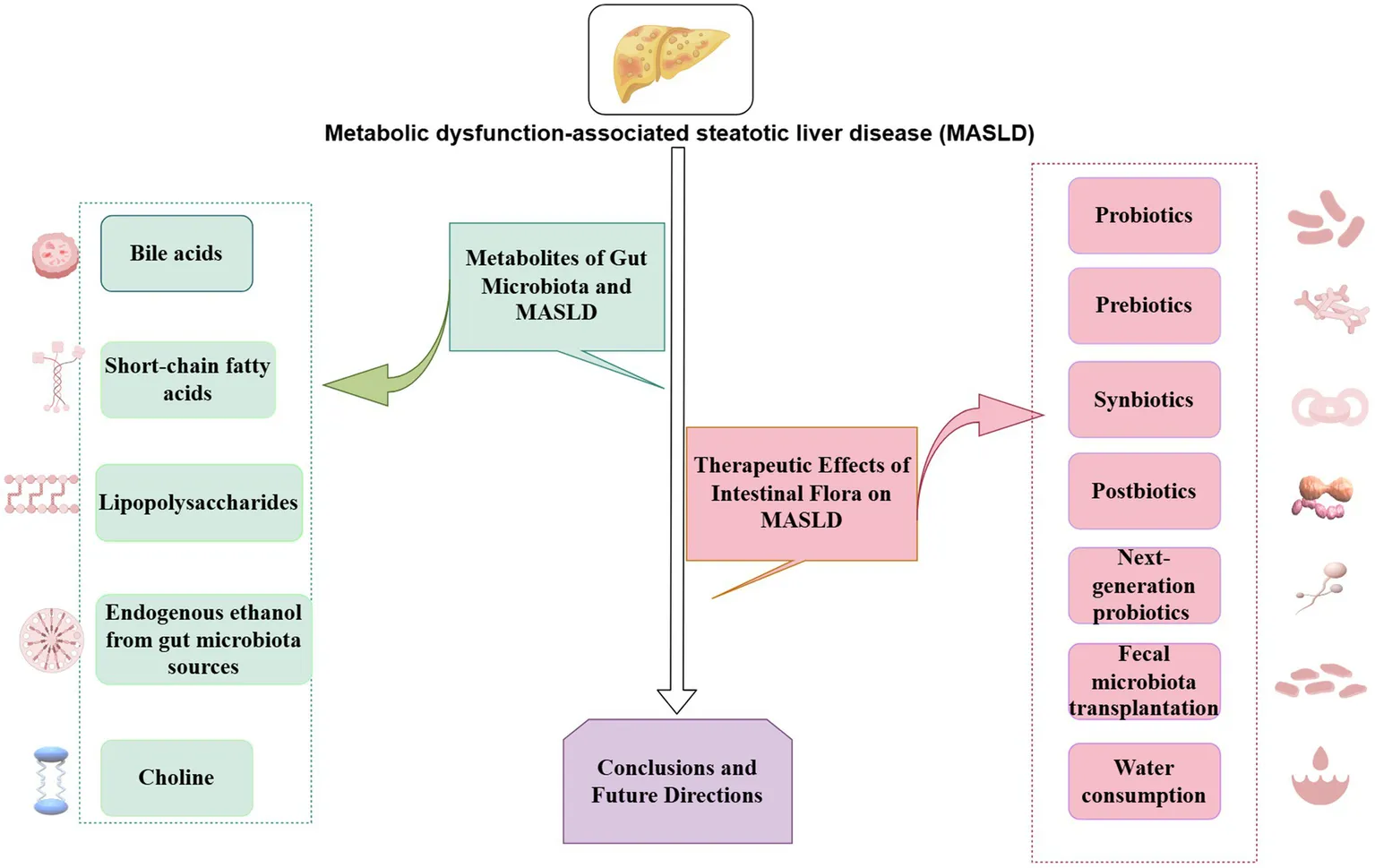 In terms of prevention and treatment, targeted intestinal flora, such as probiotics, prebiotics, synbiotics, postbiotics, FMT, NGPs, and water consumption, have achieved positive therapeutic effects in animal studies, and related clinical studies have gradually received attention. However, some problems must be resolved before these can be used as routine treatment options. Because of the risk of disease transmission between donors and recipients, standardization of donor screening, patient acceptance, adverse outcomes, and uncertain effects on recipient immunity, an FMT registry should be established to collect long-term data, follow-up results, and adverse event monitoring. Furthermore, many studies have focused on animal experiments, and clinical trials are lacking. Intestinal flora differs among regions, diets, and patients. The clinical efficacy of gut microbiota-targeted therapy for MASLD must be demonstrated in randomized controlled trials to prove the feasibility of probiotics, prebiotics, synbiotics, postbiotics, FMT, NGPs, and water consumption therapy.