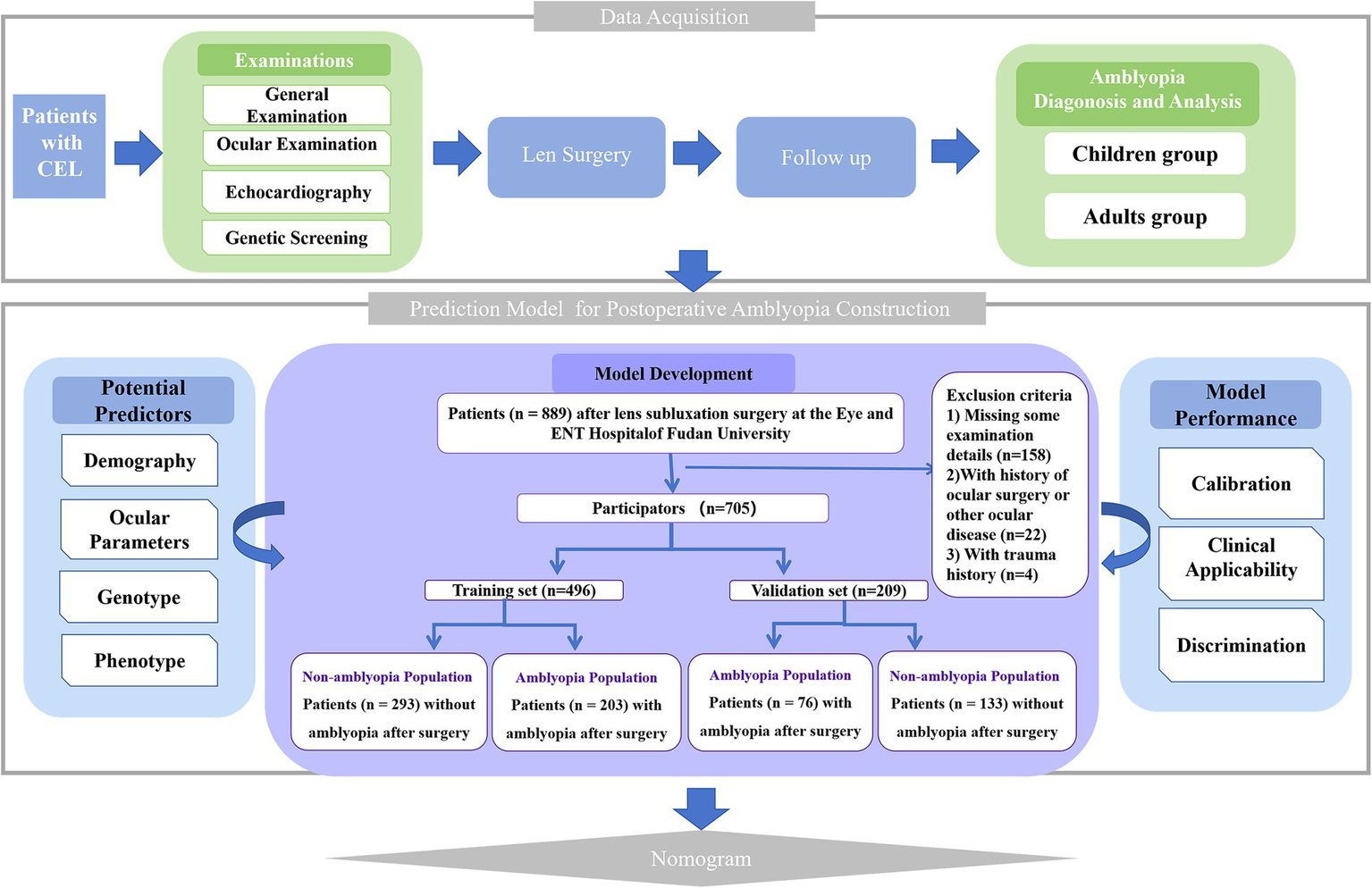 In this article, we conduct a longitudinal investigation of ametropic amblyopia among patients with CEL who underwent lens surgery at the Eye and ENT Hospital of Fudan University. Our investigation was structured around three primary objectives: first, to chart the prevalence of postoperative amblyopia across different follow-up intervals in pediatric and adults’ cohorts, respectively; second, to discern potential predictors of postoperative amblyopia by conducting a comparative analysis of preoperative demographic, ocular, cardiovascular, and genetic data between amblyopic and non-amblyopic groups; third, to develop a prediction model as well as a nomogram for the risk of preoperative amblyopia, thereby enhancing ophthalmologists’ capacity to manage amblyopia and ensuring that the optimal treatment window is not missed.
