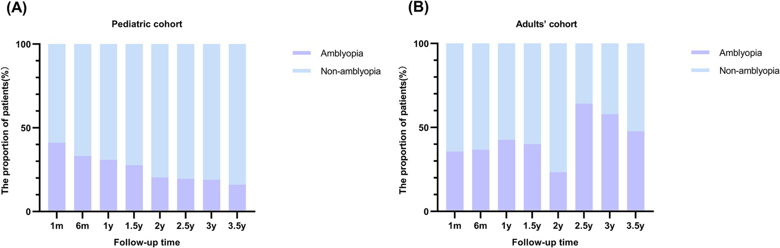 As shown in Figure 2, with a follow-up maximum of 3.5 years, the prevalence of amblyopia at various follow-up intervals post-surgery was investigated. Among the pediatric cohort (Figure 2A), there was a noticeable decline in the proportion of the amblyopia population. At 1 month after surgery, the prevalence of amblyopia was 41.13%, which decreased to 16% at 3.5 years after surgery. At 6 months, 1 year, 1.5 years, 2 years, 2.5 years, and 3 years, the prevalence was 33.09, 30.86, 27.67, 20.38, 19.51, and 18.95%, respectively. As for the adults’ cohort, no consistent pattern was identified (Figure 2B).