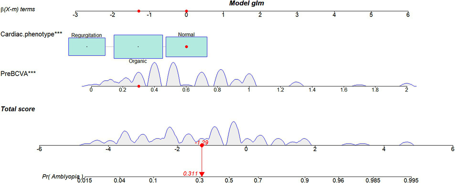 As shown in Table 1, comparative analysis suggested that there were significant differences in age (p = 0.029), z-AL (p = 0.008), BCVA (p < 0.001), and cardiac phenotype (p = 0.003) between the amblyopia and non-amblyopia groups. Upon thorough evaluation, a prediction model for postoperative amblyopia was constructed using preoperative biometrics. As shown in Table 2, BCVA and cardiac phenotype were selected as the indexes in the prediction model by multivariate logistic regression. The OR of BCVA was 0.015 (95% CI, 0.002–0.131). Compared with the normal phenotype, the OR of the regurgitation phenotype was 0.06 (95% CI, 0.01–0.345), and the OR of the organic phenotype was 0.235 (95% CI, 0.072–0.764).