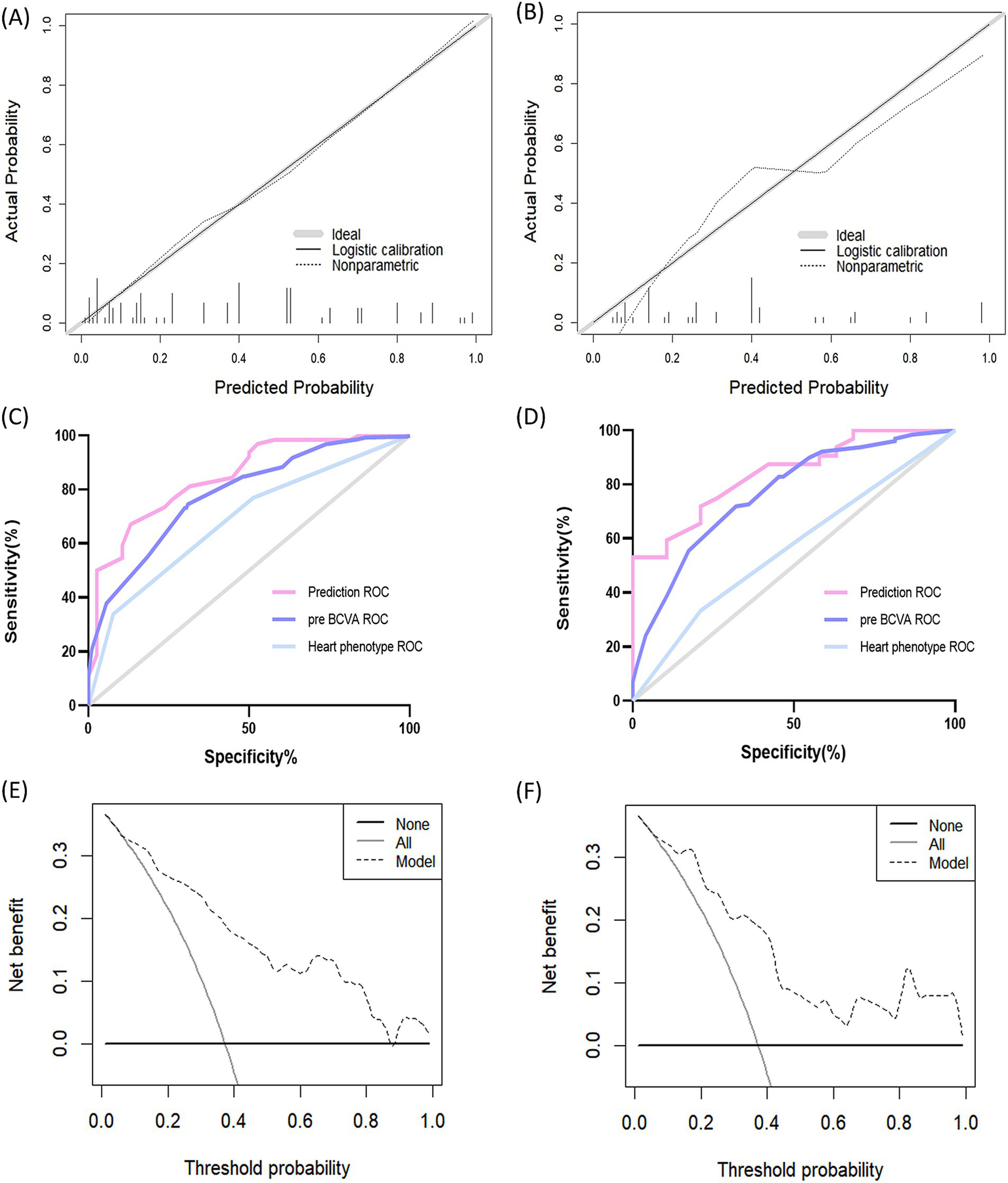 The calibration plots of the model for the training and validation cohorts were well-calibrated (Figures 4A,B). The Hosmer-Lemeshow statistical test of the model in the training cohort supported the goodness-of-fit of the model (χ2 = 9.359; p = 0.405). The AUC of the model was 0.846 (95% CI, 0.770–0.922), which was better than each of the two predictors alone, including preoperative BCVA (AUC = 0.731; 95% CI, 0.692–0.786) and cardiac phenotype (AUC = 0.660; 95% CI, 0.565–0.756; Figure 4C). These results indicate favorable discrimination by the prediction model. For the validation cohort, the AUC of the new model was 0.840 (95% CI, 0.735–0.946; Figure 4D). The Hosmer-Lemeshow analysis of the new model in the validation cohort also supported the improved goodness-of-fit of the model (χ2 = 7.052; p = 0.632). The DCA curves used to evaluate the clinical benefit of the nomogram are shown in Figures 4E,F, indicating a good clinical utility of the model.