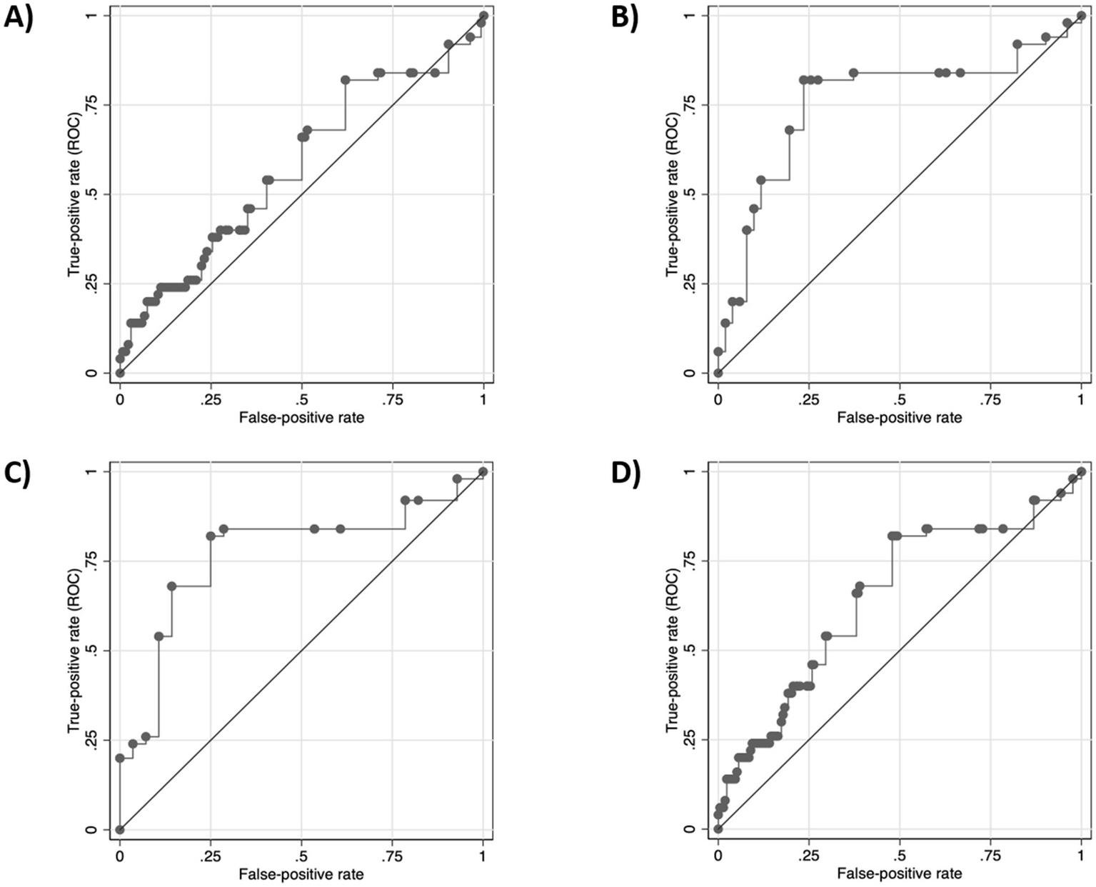 CUVAF discriminative capacity (total mean, mm2). (A) AUC of control vs. case group. (B) AUC of control vs. Low miopes (M1). (C) AUC of control vs. Moderate miopes (M2). (D) AUC of control vs. high miopes (HM).