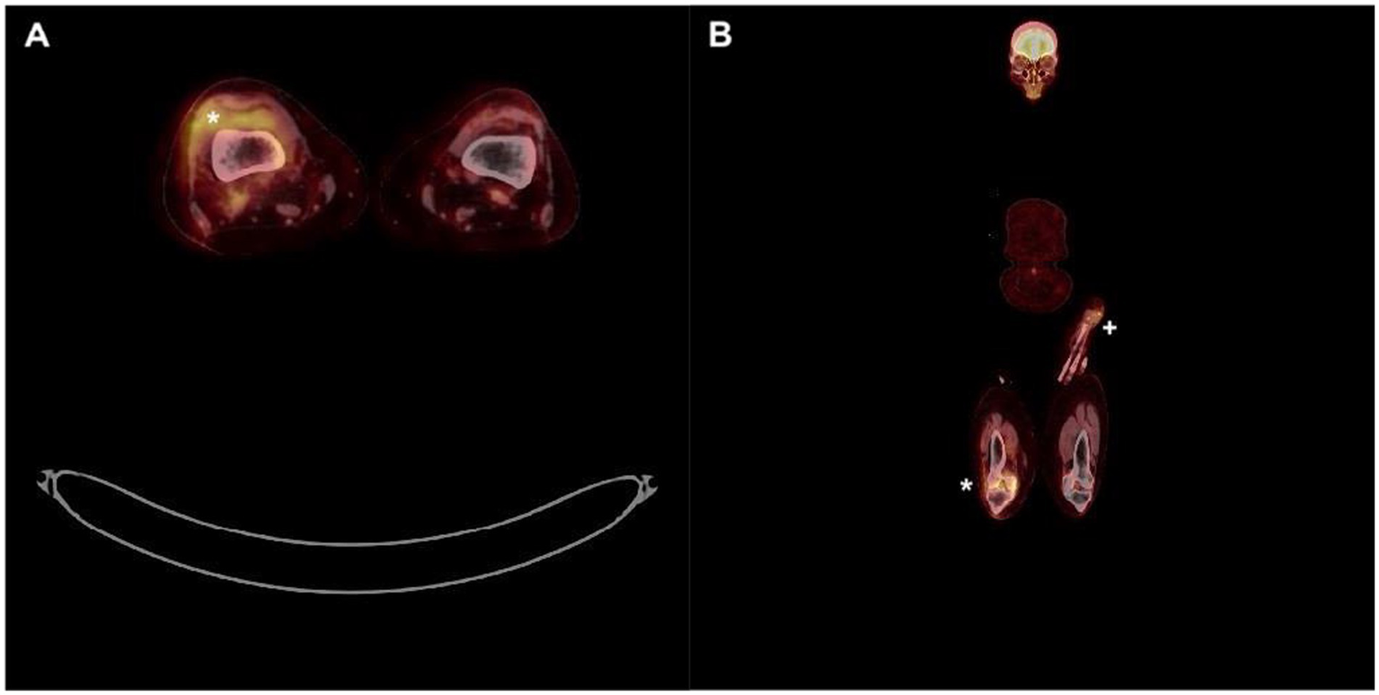 Full body 18F-FDG PET-CT. (A) Hypermetabolic synovitis of the right knee (*). (B) Focal hypermetabolic activity in the left forearm fistula area (+) as well as right knee (*).