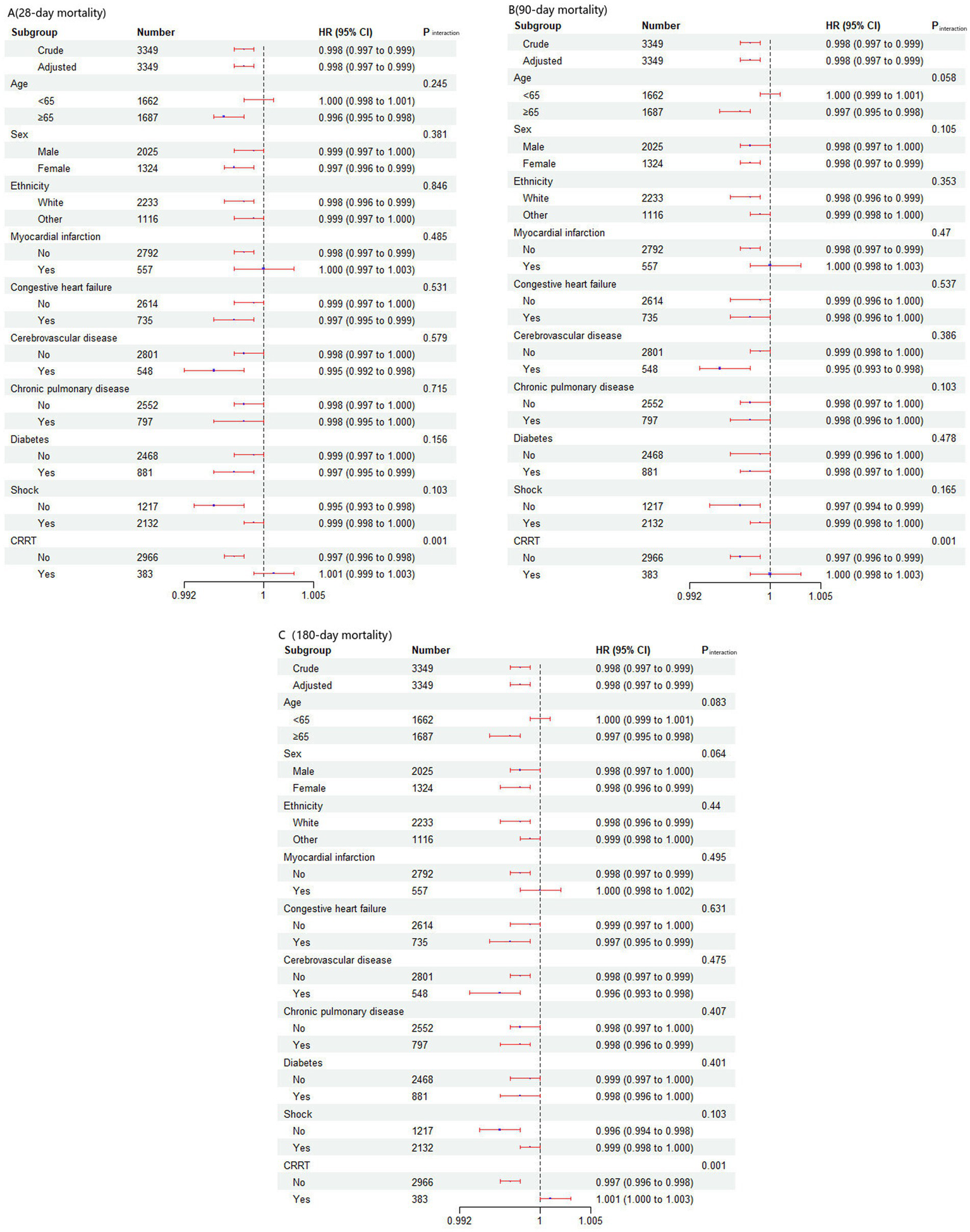 Subgroup analyses were performed on the basis of age (<65 years and ≥ 65 years), sex, race, history of myocardial infarction, congestive heart failure, cerebrovascular disease, chronic pulmonary disease, diabetes, CRRT and septic shock. Sensitivity analyses included Cox proportional hazards regression analyses excluding patients with myocardial infarction and those with both myocardial infarction and congestive heart failure to further validate the results. Analyses were also conducted by excluding patients with an ICU stay of less than 2 days to ensure the robustness of the findings.