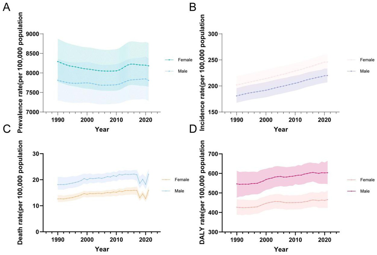 Data were extracted from the Global Burden of Disease (GBD) 2021 database, covering prevalence, incidence, mortality, and disability-adjusted life years (DALYs). These were presented as counts per 100,000 population and age-standardized rates, with uncertainty intervals (UIs) to highlight variability. Joinpoint regression was used to assess trends over the 30-year period.