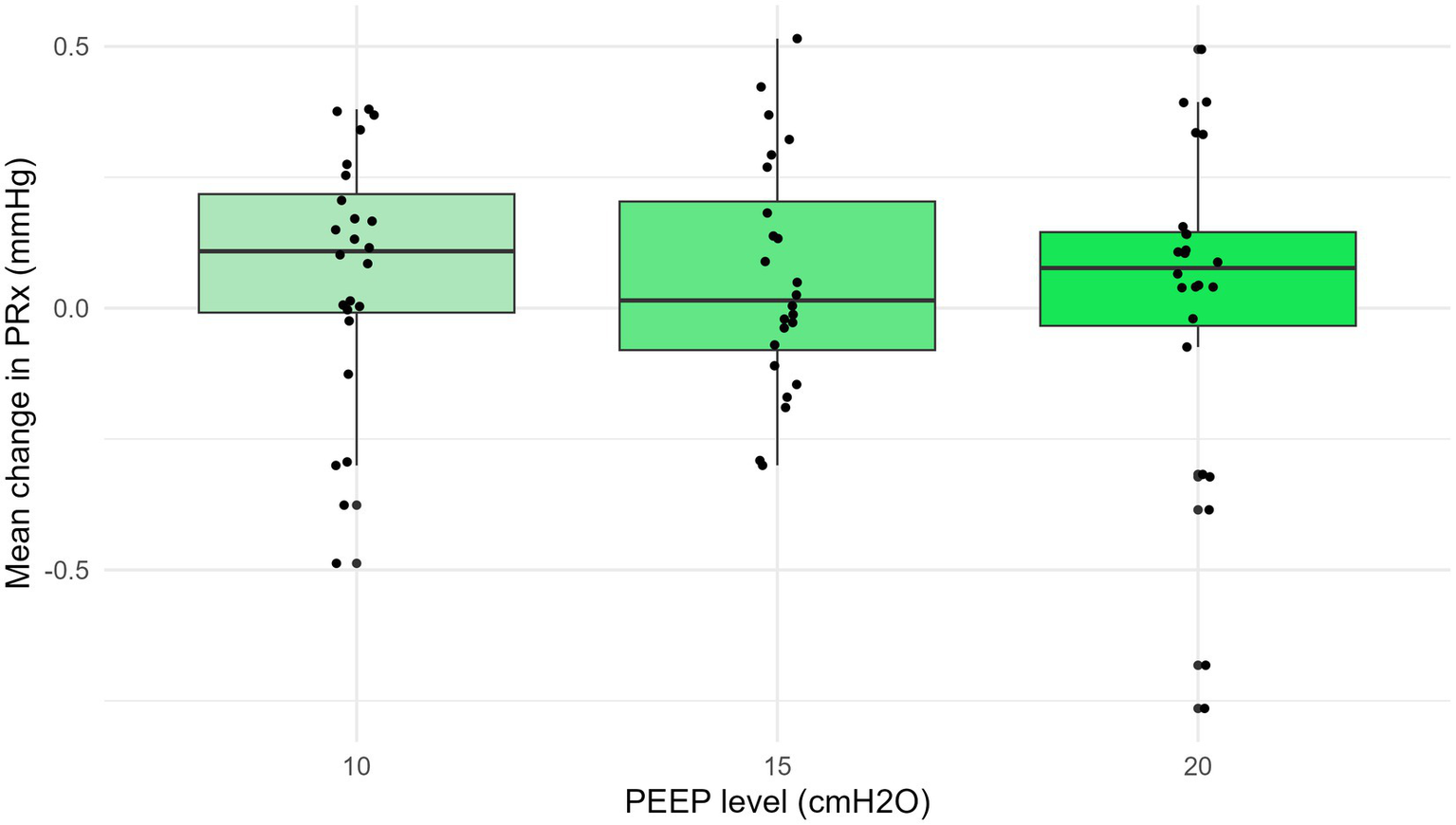 The treatment effects were evaluated by comparing values during the intervention periods (PEEP 10, 15, 20 cmH2O) to the baseline period (PEEP 5 cmH2O).