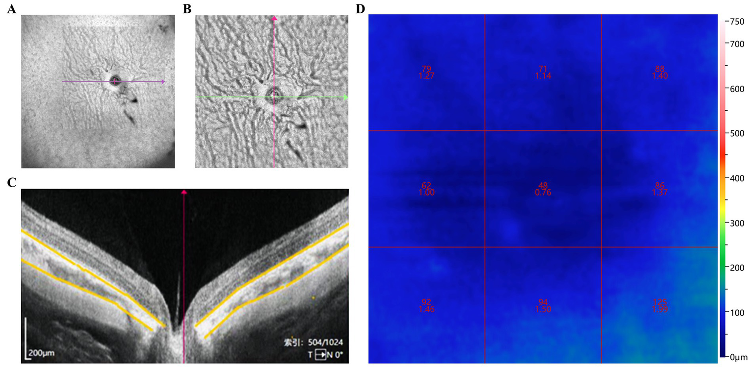 Assessment of ChT and CVI changes in guinea pigs. (A) Wide-angle view of the retinal blood flow in guinea pig eyes; (B) Blood flow around the optic nerve and peripheral retina; (C) ChT centered on the optic disk (area marked by yellow line); (D) CVI in nine regions centered on the optic disk. ChT: Choroidal thickness; CVI: Choroidal vascularity index.