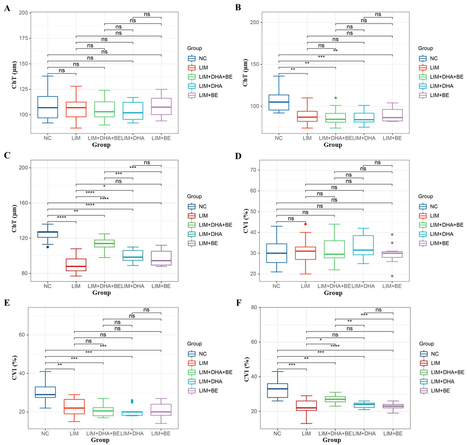 Comparison of ChT and CVI results in guinea pigs. (A) Comparison of ChT across groups before modeling; (B) Comparison of ChT across groups 4 weeks after modeling; (C) Comparison of ChT across groups 8 weeks after treatment; (D) Comparison of CVI across groups before modeling; (E) Comparison of CVI across groups 4 weeks after modeling; (F) Comparison of CVI across groups 8 weeks after treatment. ChT: Choroidal thickness; CVI: Choroidal vascularity index. ns p > 0.05, *p < 0.05, **p < 0.01, ***p < 0.001, ****p < 0.0001.