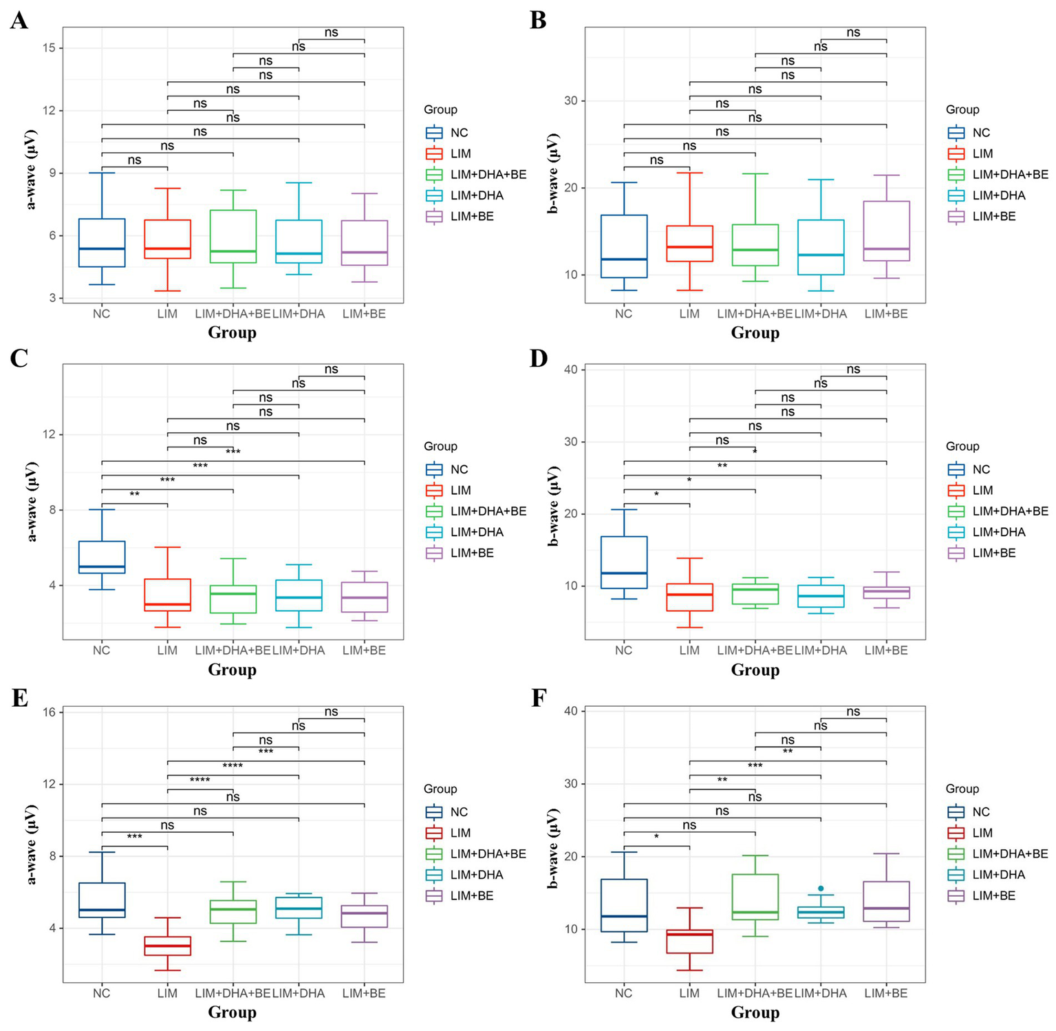 Comparison of a-wave and b-wave results in Max-ERG; (A) Comparison of a-wave results in Max-ERG among groups before modeling; (B) Comparison of b-wave results in Max-ERG among groups before modeling; (C) Comparison of a-wave results in Max-ERG among groups 4 weeks after modeling; (D) Comparison of b-wave results in Max-ERG among groups 4 weeks after modeling; (E) Comparison of a-wave results in Max-ERG among groups after 8 weeks of treatment; (F) Comparison of b-wave results in Max-ERG among groups after 8 weeks of treatment. Max-ERG: Maximal mixed response in dark adaptation; NC: Normal control; LIM: Lens-induced myopia; DHA: Docosahexaenoic acid; BE: Bilberry extract. ns p > 0.05, *p < 0.05, **p < 0.01, ***p < 0.001, ****p < 0.0001.