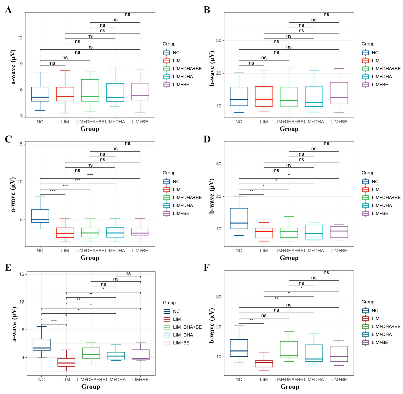Comparison of a-wave and b-wave results in Cone-ERG. (A) Comparison of a-wave results in Cone-ERG among groups before modeling; (B) Comparison of b-wave results in Cone-ERG among groups before modeling; (C) Comparison of a-wave results in Cone-ERG among groups 4 weeks after modeling; (D) Comparison of b-wave results in Cone-ERG among groups 4 weeks after modeling; (E) Comparison of a-wave results in Cone-ERG among groups after 8 weeks of treatment; (F) Comparison of b-wave results in Cone-ERG among groups after 8 weeks of treatment. Cone-ERG: Cone cell response in light adaptation; NC: Normal control; LIM: Lens-induced myopia; DHA: Docosahexaenoic acid; BE: Bilberry extract. ns p > 0.05, *p < 0.05, **p < 0.01, ***p < 0.001.