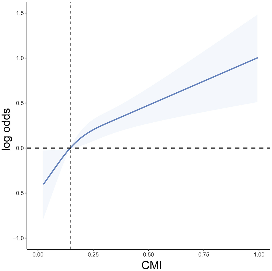 Weighted logistic regression results showed that as CMI increased, the risk of heart failure significantly elevated. In the unadjusted model, compared to the lowest quartile (Q1), the odds ratio (OR) for the second quartile (Q2) was 2.03 (95% CI: 1.39–2.96, P < 0.001), for the third quartile (Q3) was 2.82 (95% CI: 1.95–4.09, P < 0.001), and for the highest quartile (Q4) was 5.38 (95% CI: 3.75–7.72, P < 0.001). In Model I, adjusted for age, sex, and race/ethnicity, the OR for Q4 remained 2.77 (95% CI: 1.92–3.99, P < 0.001). After further adjusting for BMI, education level, smoking, drinking, diabetes, and hypertension in Model II, the OR for Q4 was 1.87 (95% CI: 1.26–2.76, P = 0.002). Therefore, CMI is significantly associated with the occurrence of heart failure (Table 2). Additionally, we used RCS curve for a visual analysis of the relationship between CMI and the risk of heart failure. We found that as CMI levels increased, the risk of heart failure also continuously increased, showing a linear positive correlation between the two (Figure 2). The NHANES data has a complex multistage sampling design, and we use weighted regression models in the primary analysis to ensure that the sample represents the general population. Unweighted logistic regression can help further test the robustness of the model, verify the necessity of the weighted design, and reveal potential sampling bias. Therefore, we applied unweighted analysis as a sensitivity analysis to verify whether the results remain consistent without considering the weighting. In sensitivity analysis, after adjusting for confounders, CMI was still significantly associated with HF in Q4 (OR 1.69, 95% CI 1.28–2.26, P < 0.001). These findings in sensitive analysis suggest consists with Amin analysis (Table 3).