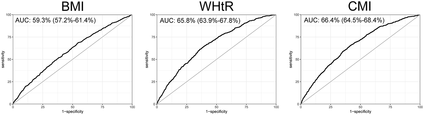 ROC curves of BMI, WtHR, and CMI for predicting heart failure.