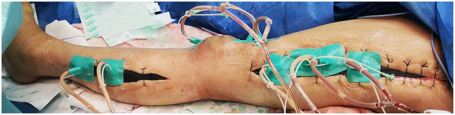 While there was evident edema in the subcutaneous soft tissue of the left lower leg, no pus or abscess formation was observed in the subcutaneous or muscle compartments. Following repeated debridement, irrigation, and hemostasis, the wound was closed using Vacuum sealing drainage (VSD), as shown in Figure 5.
