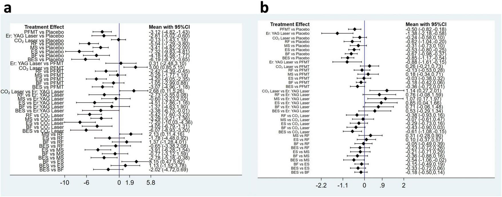 Prediction interval plots (Figure 3B) and league tables (Table 3) were used to compare the effectiveness of various conservative treatment strategies in reducing urine leakage. Er: YAG laser demonstrated greater efficacy in reducing leakage compared to both electrical stimulation [SMD = −0.85, 95% CI (−1.66, −0.04)] and pelvic floor muscle training [SMD = −0.88, 95% CI (−1.61, −0.15)]. Additionally, Er: YAG laser [SMD = −1.07, 95% CI (−1.97, −0.17)] and biofeedback electrical stimulation [SMD = −0.54, 95% CI (−1.06, −0.02)] were more effective than magnetic stimulation. When compared to the CO2 laser, both the Er: YAG laser [SMD = −1.14, 95% CI (−2.01, −0.27)] and biofeedback electrical stimulation [SMD = −0.61, 95% CI (−1.08, −0.15)] were more effective. Against placebo, several interventions were more effective: Er: YAG laser [SMD = −1.38, 95% CI (−2.18, −0.58)], biofeedback electrical stimulation [SMD = −0.85, 95% CI (−1.17, −0.54)], biofeedback [SMD = −0.67, 95% CI (−0.98, −0.37)], radiofrequency [SMD = −0.62, 95% CI (−1.04, −0.20)], electrical stimulation [SMD = −0.53, 95% CI (−0.80, −0.25)], and pelvic floor muscle training [SMD = −0.50, 95% CI (−0.82, −0.18)]. No statistically significant differences were observed when comparing the effects of other conservative treatment measures on urine leakage.