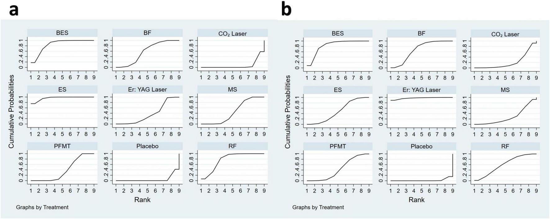 The effectiveness of each intervention in reducing urine leakage was ranked using SUCRA analysis. Er: YAG laser (SUCRA = 97.5%) was the highest-ranked therapy, followed by biofeedback electrical stimulation (SUCRA = 83.4%), biofeedback (SUCRA = 67.0%), radiofrequency (SUCRA = 59.5%), electrical stimulation (SUCRA = 48.4%), pelvic floor muscle training (SUCRA = 43.0%), magnetic stimulation (SUCRA = 27.8%), and CO2 laser (SUCRA = 21.4%) (Figure 4B).
