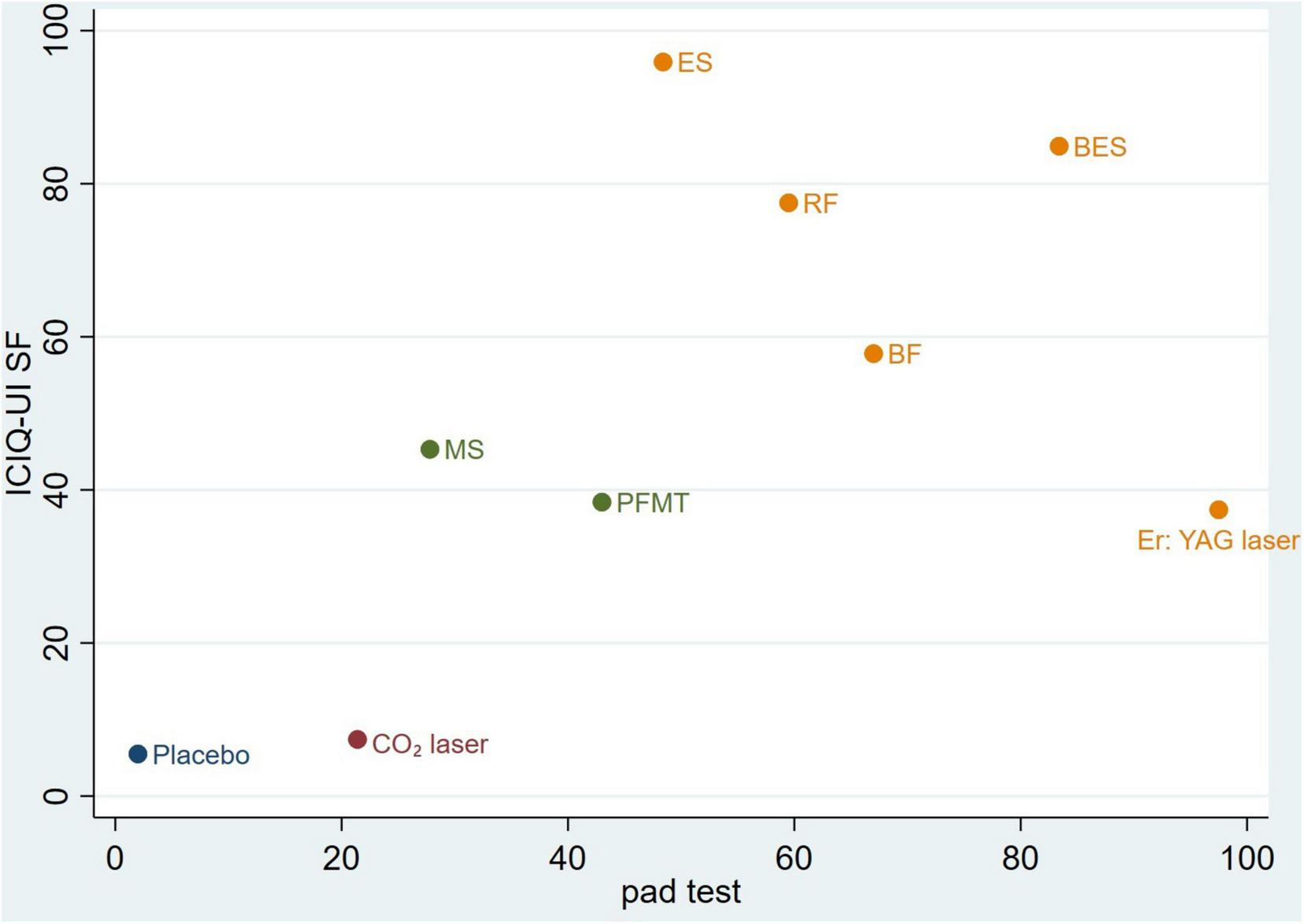 Figure 5. Clustered ranking for the conservative intervention categories on ICIQ-UI SF scores and pad test. The plot is based on the clustered analysis of SUCRA values (horizontal and vertical axes values). Treatments lying in the upper right corner are considered to perform well for both outcomes. Each color represents a group of treatments that belong to the same cluster. RF, radiofrequency; MS, magnetic stimulation; ES, electrical stimulation; BES, biofeedback electrical stimulation; BF, biofeedback; PFMT, pelvic floor muscle training.