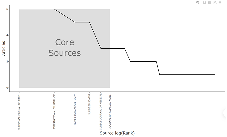 Bradford's Law suggests that the most significant sources can be identified among the first 50 articles (26). It categorizes sources into different zones. The first zone is considered the core source, encompassing the majority of relevant articles from the initial 50 selected. Among the top 20 sources, the “European Journal of Cardiovascular Nursing” and the “Journal of Clinical Nursing” are classified in Zone 1, indicating that these are the primary sources for relevant searches (see Figure 3 and Table 1).