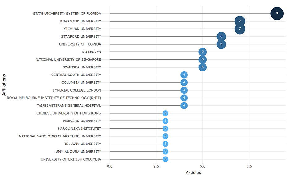 We identified the top 20 most relevant affiliations, which represent the contributions of prominent institutions in producing articles on the selected topic. The State University System of Florida leads with nine articles, followed by King Saud University and Sichuan University, each with seven articles, along with the others mentioned in Figure 4. This underscores these institutions as key players in ChatGPT in nursing research.