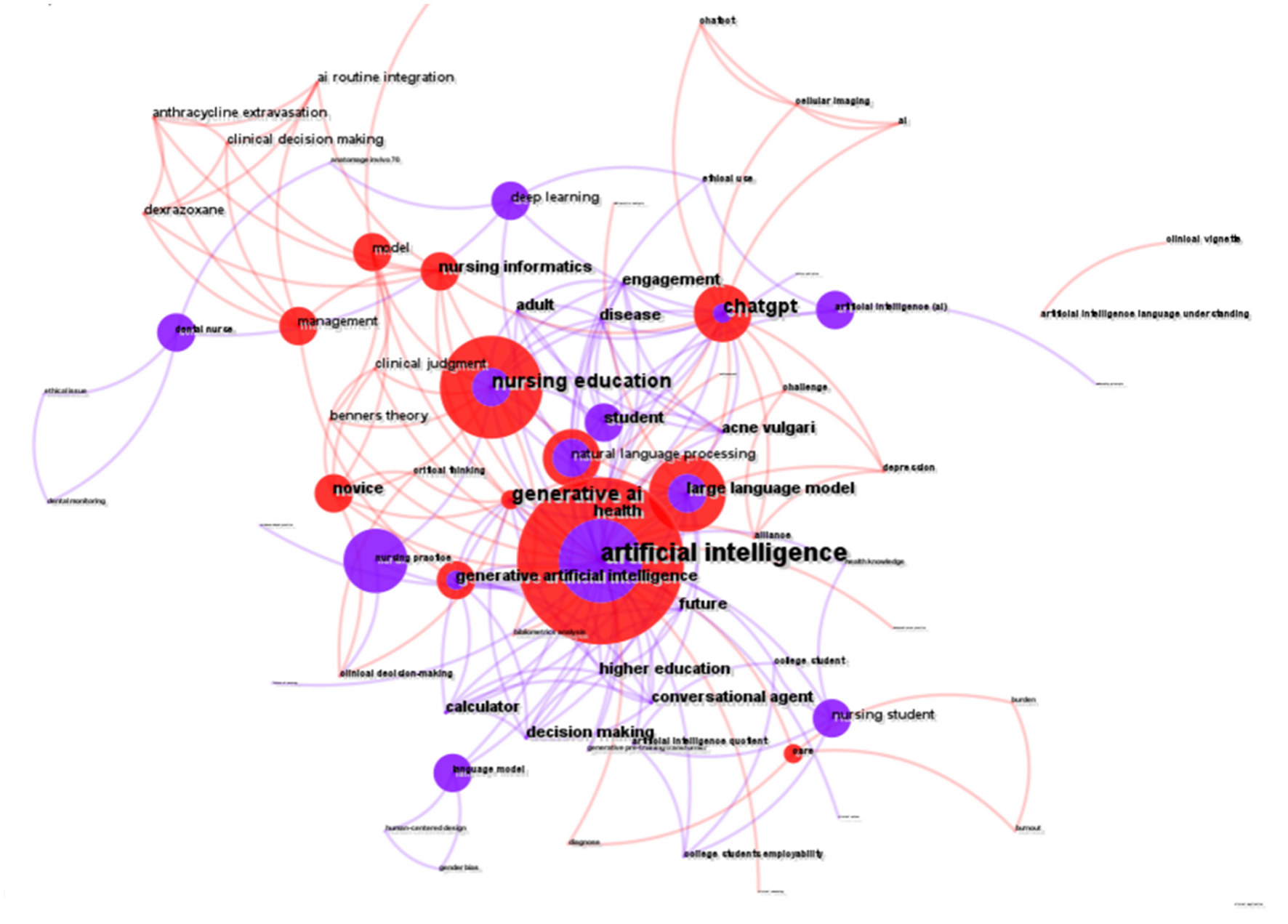 A total of 81 articles published by 67 authors were retrieved from the Web of Science Core Collection database, covering the period of June 30, 2024. The number of published studies has exhibited an increasing trend. The “European Journal of Cardiovascular Nursing” emerged as the most productive journals, while the USA, the UK, and China were identified as the leading countries in terms of publication output. The top 10 keywords identified in this study include artificial intelligence, nursing education, large language models, ChatGPT, natural language processing, generative artificial intelligence, care, nursing practice, clinical decision-making, and deep learning.