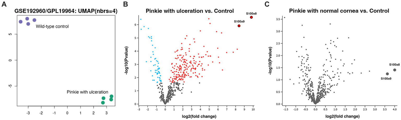 S100a8 and S100a9, known DAMPs, are significantly induced in a mouse model of DED with corneal ulceration compared to the wild-type control with normal corneal epithelium. GEO dataset GSE192960 (platform GPL19964) deposited by Pflugfelder and colleagues was analyzed for differentially expressed genes, with significance taken at an adjusted p value of ≤0.05. Panel (A) illustrates a uniform manifold approximation and projection (UMAP) clustering analysis, showing the distinct expression patterns in the wild-type control versus the Pinkie DED model with corneal ulceration. Panel (B) shows a Volcano plot of differentially expressed genes (DEGs) with the red dots indicating significant up-regulation and the blue dots representing significant down-regulation (gray dots indicate no statistically significant difference). The most highly differentially expressed gene is S100a8, with S100a9 also significantly elevated, as indicated in the figure. Panel (C) is a comparison of gene expression between the wild-type control and the Pinkie DED model without ulceration. Note that two of the most highly DEGs in this DED model with corneal ulceration are S100a8 and S100a9, which are also upregulated in the DED model with normal corneas, although the values did not achieve statistical significance.