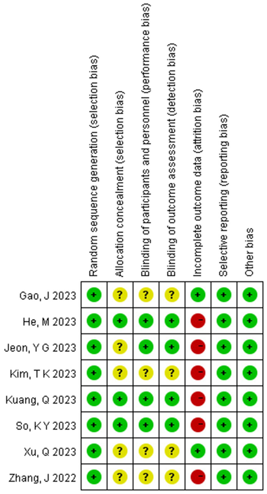 Summary of risk of bias across all trials (The figure includes seven bias risk assessments included in the study: green represents a low risk; yellow represents an unknown risk; red represents a high risk).