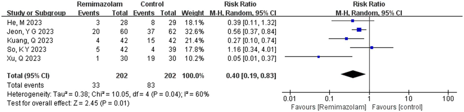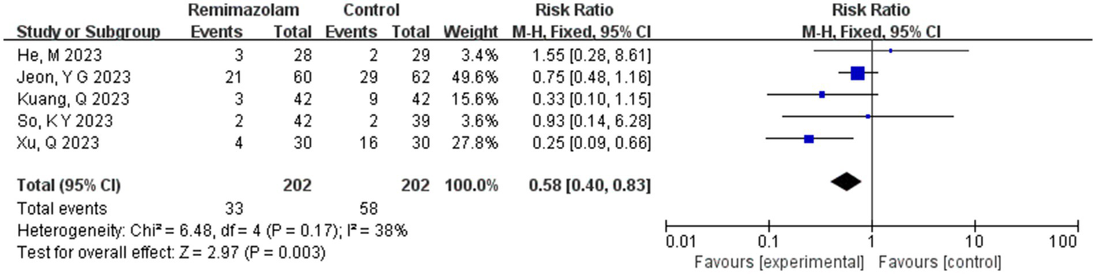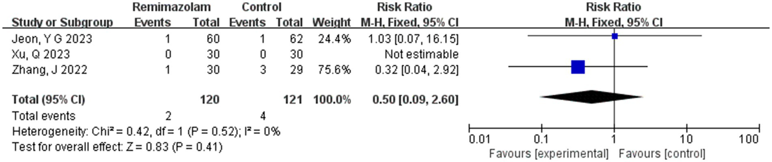 Three studies involving 185 elderly patients (16, 18, 20) compared the incidence of injection pain between the remimazolam group (N = 104) and the propofol group (N = 81). A heterogeneity test (I2 = 0% < 50%, p = 0.96 > 0.1) indicated no heterogeneity among the included studies. Using a fixed-effects model, the results showed an RR of 0.04 (95% CI: [0.01, 0.16], Z = 4.53, p < 0.00001, Figure 17). This suggests that the incidence of injection pain in the remimazolam group was only 4% of that in the propofol group, a statistically significant difference. These findings indicate that, for elderly patients undergoing general anesthesia, remimazolam significantly reduces the incidence of injection pain compared to propofol.